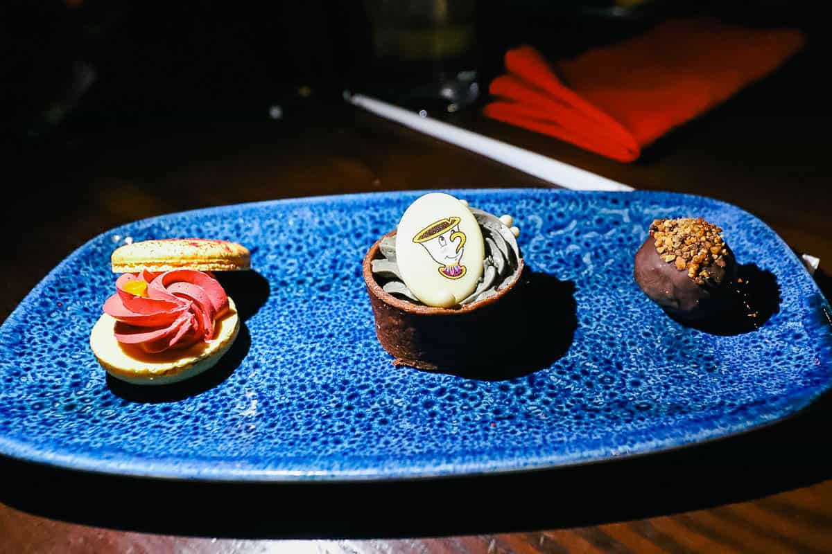 First, on the trio of desserts, we have a chocolate tart. This tart is comprised of a shell piped full of “the grey stuff.” A white chocolate medallion featuring Chip from Beauty and the Beast sits delicately on top of the cream.