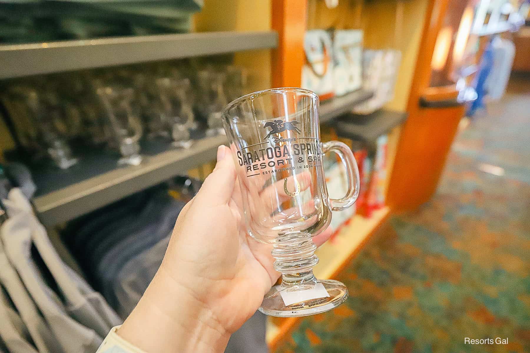 A clear highball glass features a handle and the resort’s logo.