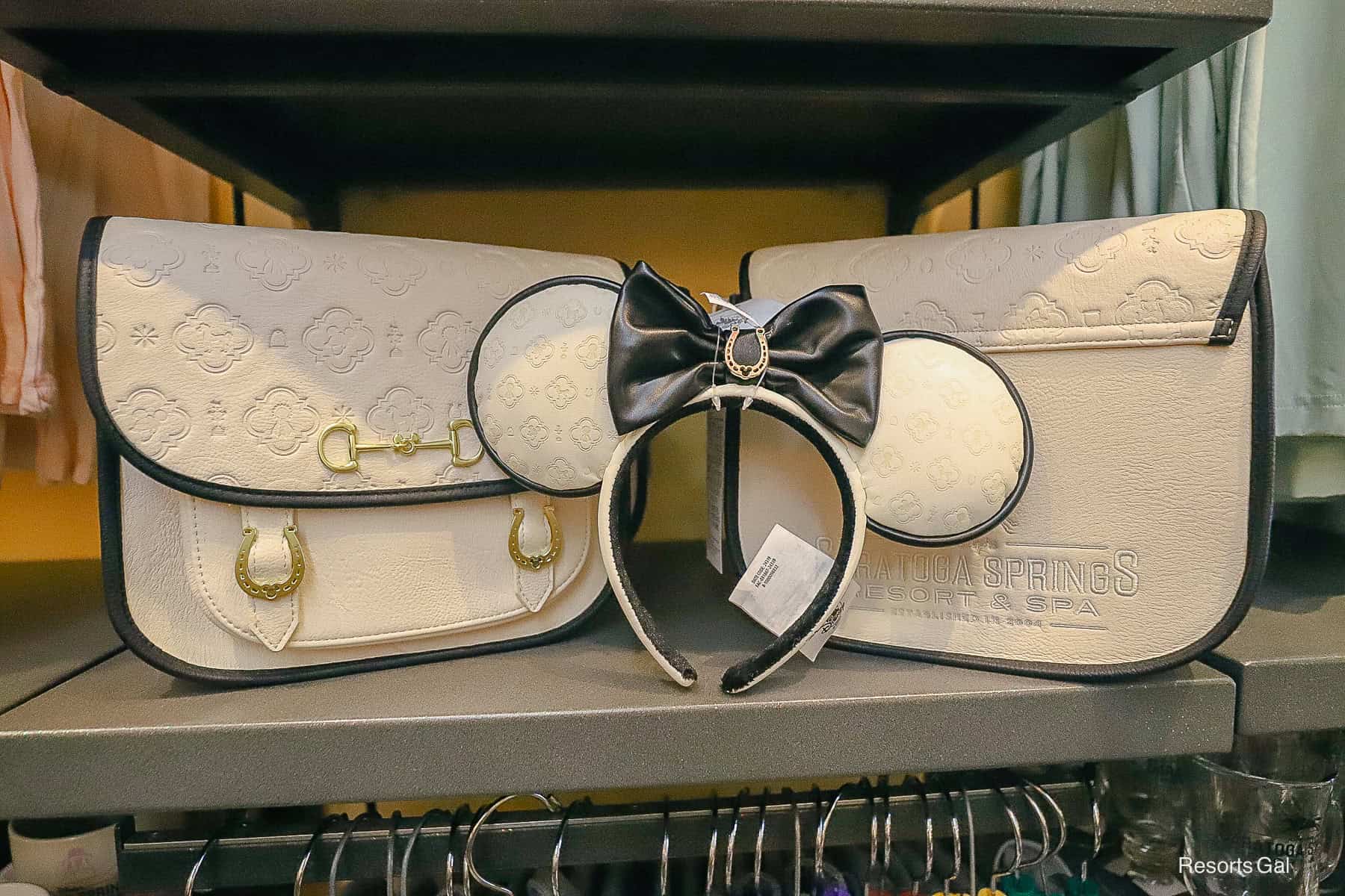 A DisneyParks Loungefly handbag representing Disney’s Saratoga Springs was available. It has a cream-colored body with black trim and gold hardware. It has a saddle bag style with an embossed design on the foldover area. The back has the resort’s logo embossed and the traditional Disney Parks Loungefly metal plate.