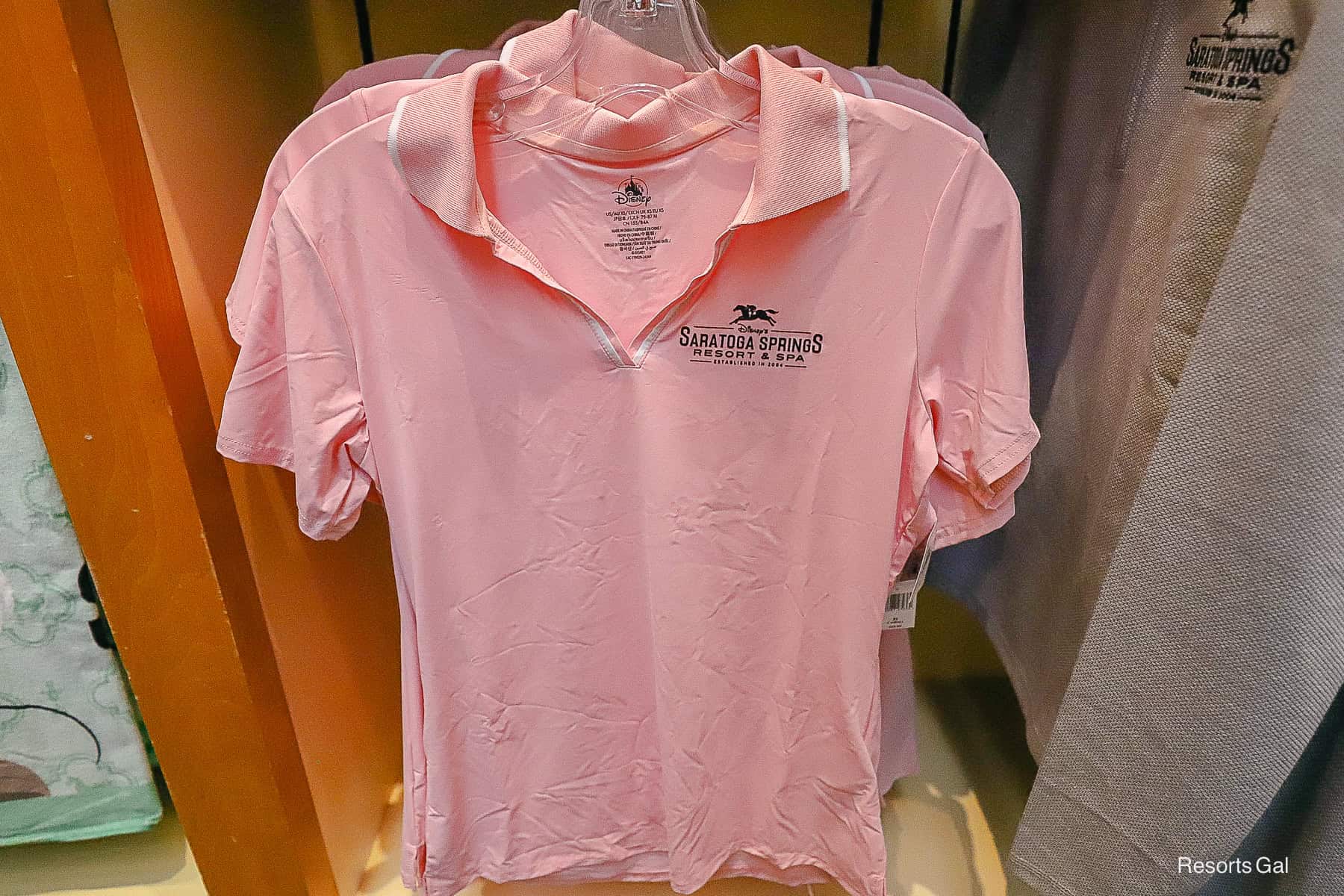A ladies’ fitted t-shirt was also available in pink. This three-button polo has white trim around the collar and the resort’s logo in black.