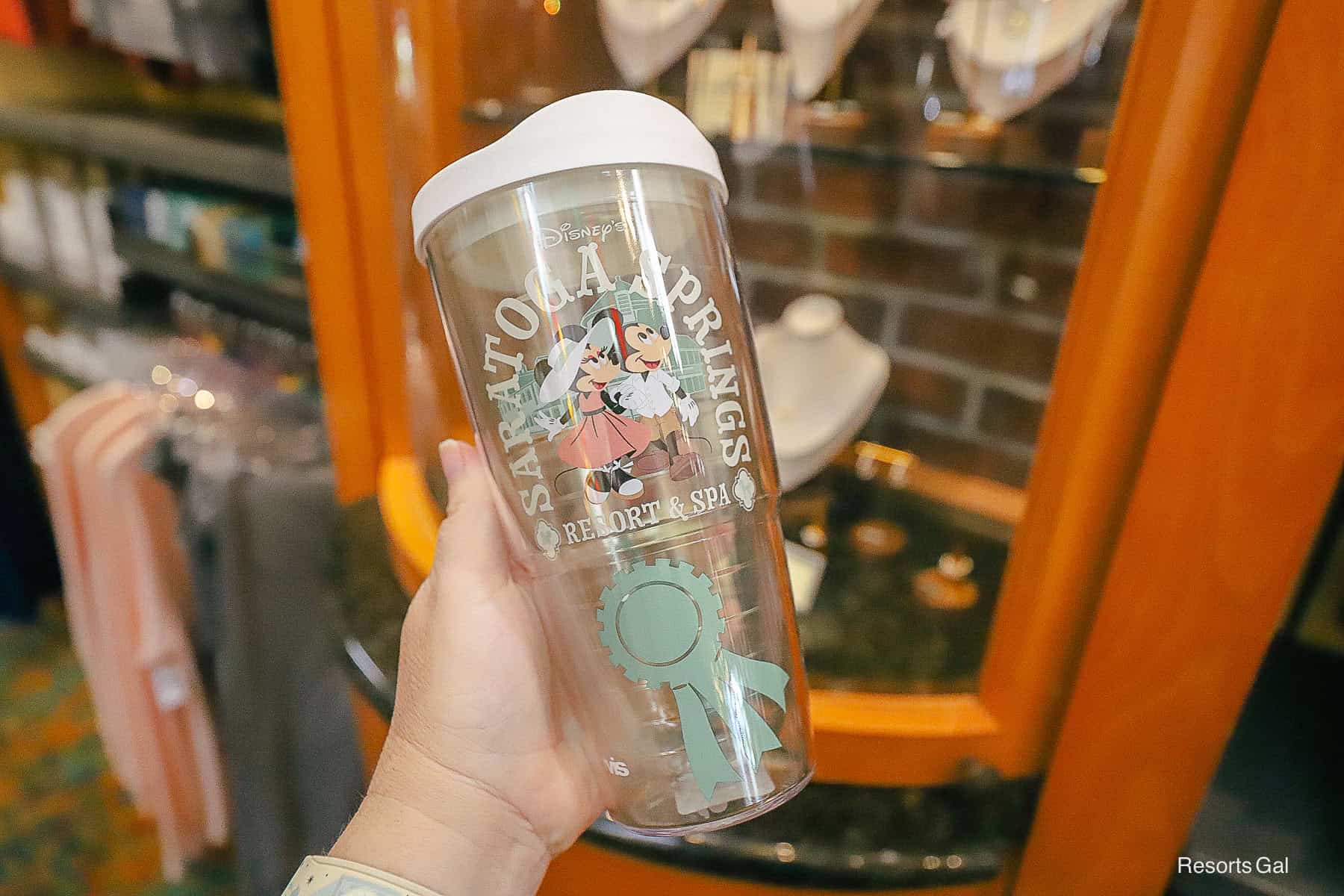 A Tervis Tumbler was available with the same resort look featuring Mickey and Minnie Mouse on an afternoon stroll around Disney’s Saratoga Springs. It had a white lid and a mint green winner’s ribbon underneath the logo.
