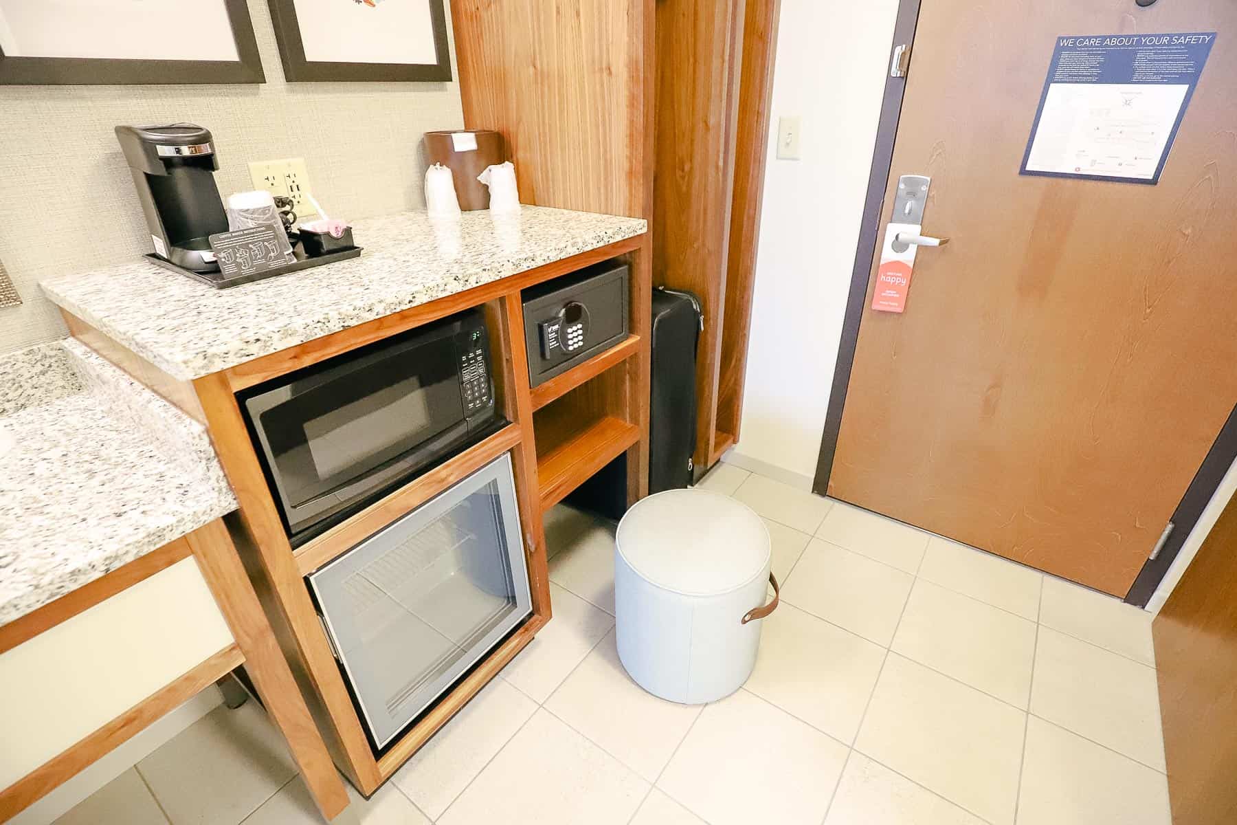 Under the counter, you’ll find a microwave, a mini-refrigerator, a safe, and a cubby hole for storage.