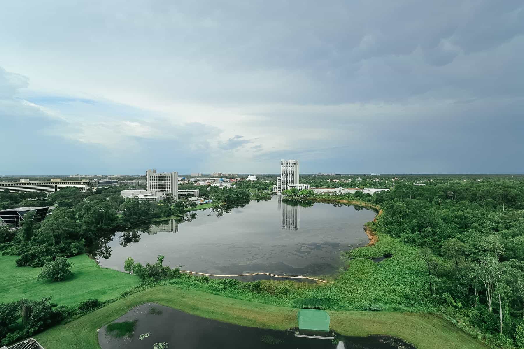 The back side of the hotel faces Disney Springs and the rest of the Walt Disney World Resort. So at night, you could see a few fireworks in the distance. Here is that view, which includes the Hilton Orlando Buena Vista Palace across the lake. Spaceship Earth is further back to the right, but it’s nearly blocked by the building that holds Guardians of the Galaxy: Cosmic Rewind.