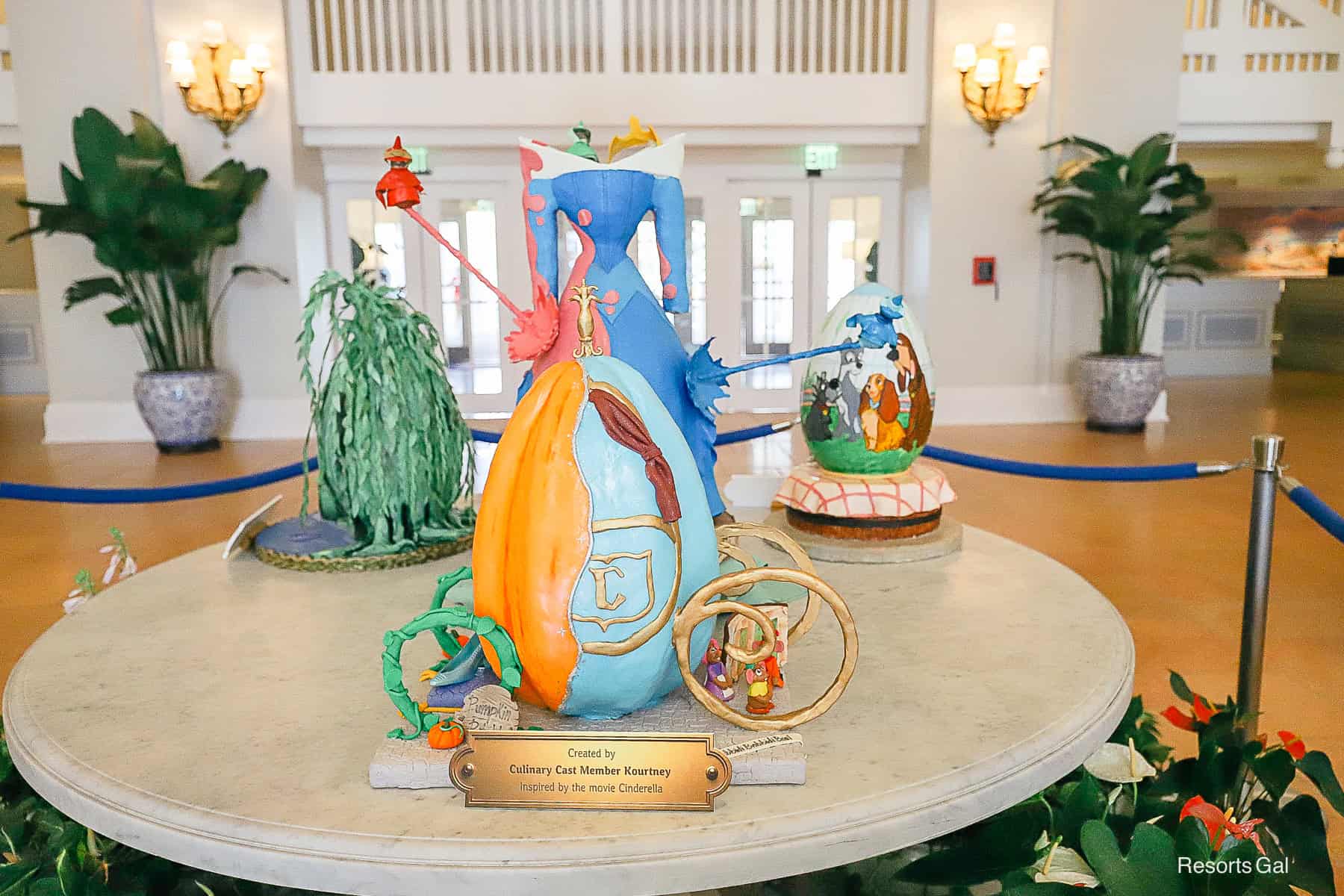 The lobby’s center table holds four eggs; the first features Cinderella’s coach as it transitions from a pumpkin into a horse and carriage.