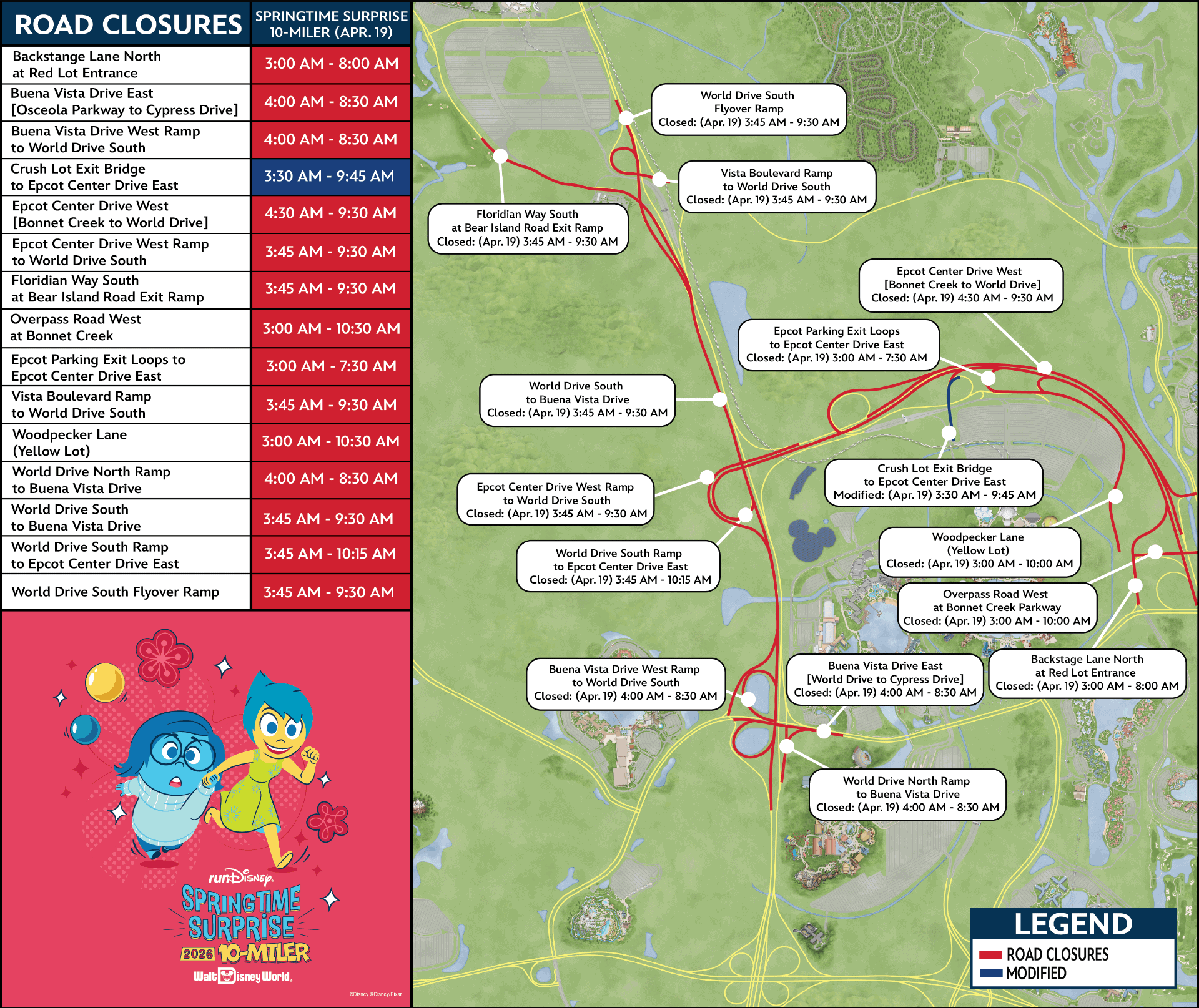 This later opening is typical for runDisney race weekends. Most races start and finish on the far end of Epcot’s parking lot. If you’re driving in the area over this weekend, you’ll also want to be aware of potential road closures on the morning of the race. Here is the map with road closures and times for the Springtime Surprise Ten-Miler, which is held on Sunday, April 19, 2026.