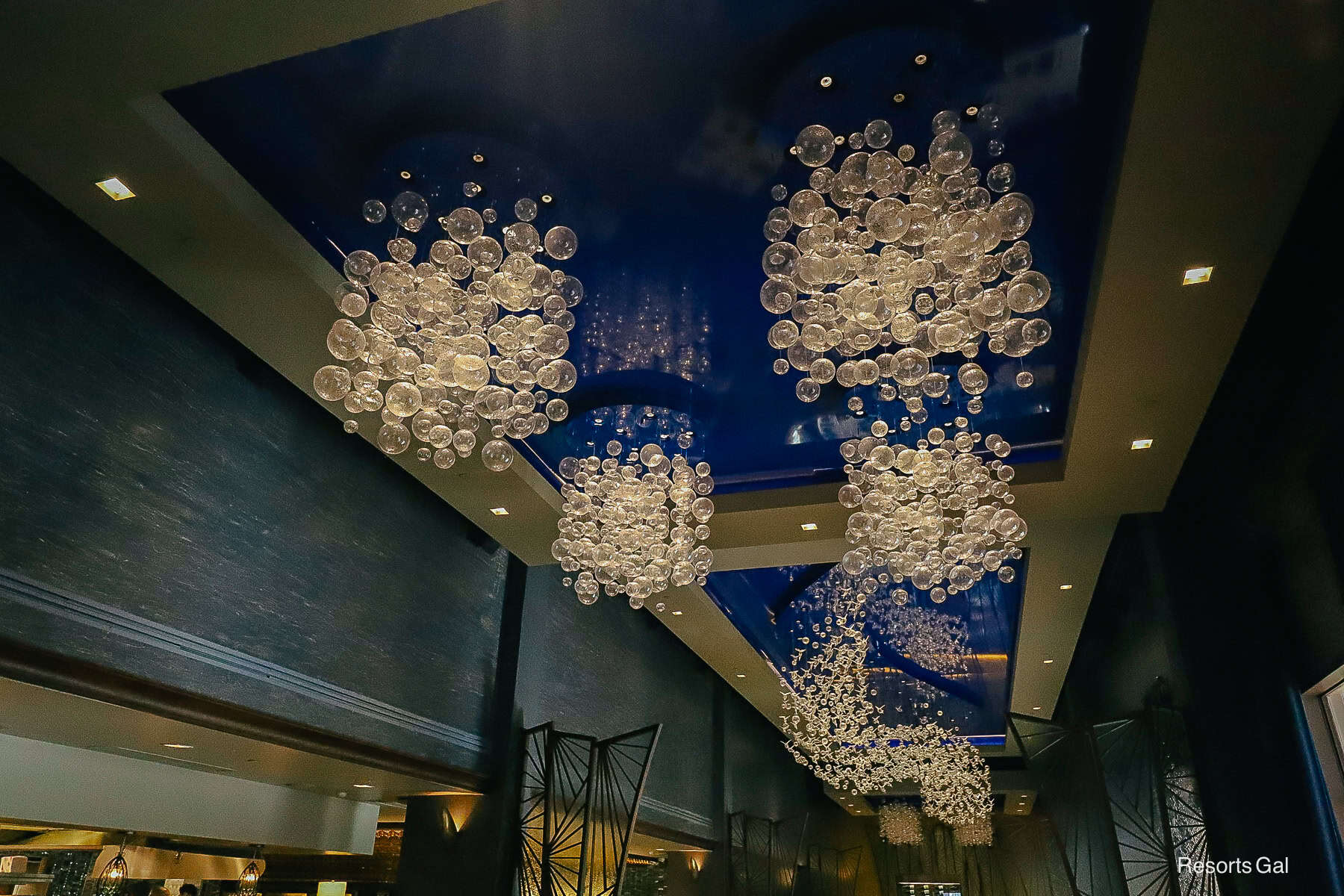 Flying Fish sits on the corner of Disney’s Boardwalk between the resort’s green lawn and Abracadabar. The restaurant shares an open area inside that connects to the magic-themed bar. However, Flying Fish is considerably more formal with a modern, contemporary feel. The interior offers that kind of black-and-white look with a true blue pop of color. The most attention-drawing feature is the restaurant’s light fixtures. Some look like clear bubbles from under the depths of the ocean. The centerpiece features a myriad of tiny glass fish appearing as though they are swimming like a school through the ocean.