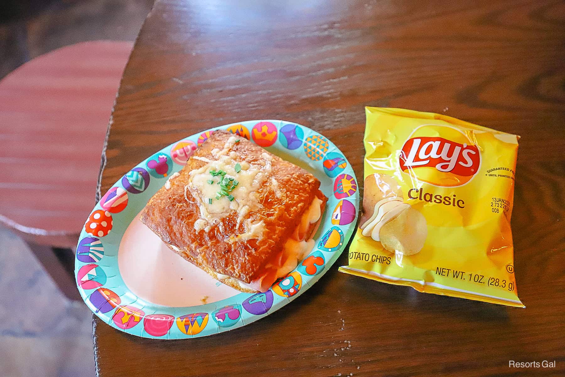 The Ham and Gruyère Sandwich is a crispy croissant dough that’s filled with ham and gruyère cheese. It comes with a small bag of potato chips. If you’ve ever had puff pastry, this is pretty much the same thing. However, it’s stuffed with hot ham and melted cheese.