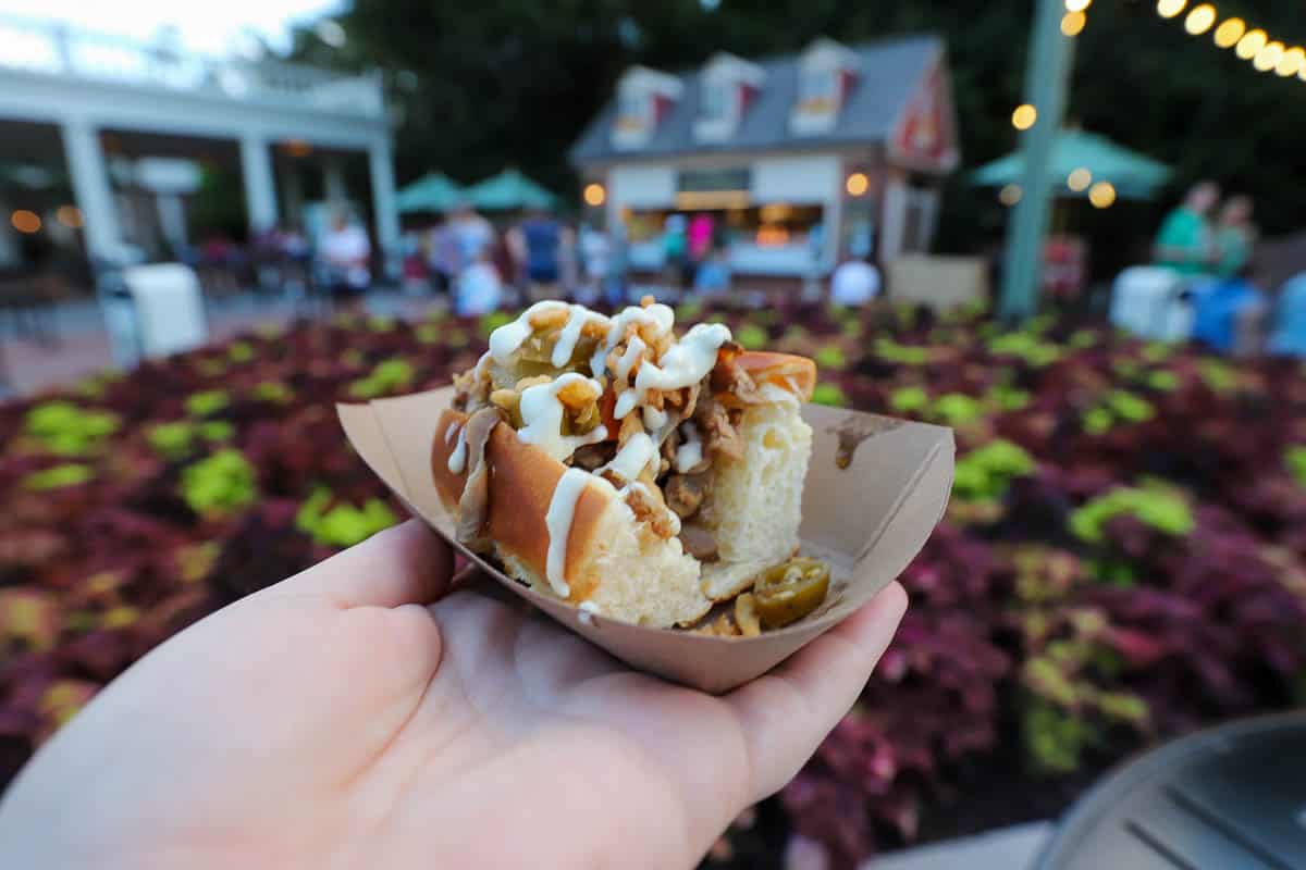 Flavors of America sits on the right-hand side of the American Pavilion at Epcot. This booth tends to be pretty popular, so you will likely encounter a wait. However, the area has plenty of picnic tables in the surrounding area. So when you receive your order, you should be able to find a seat. Finding a table after picking up your food is half the battle at many booths.