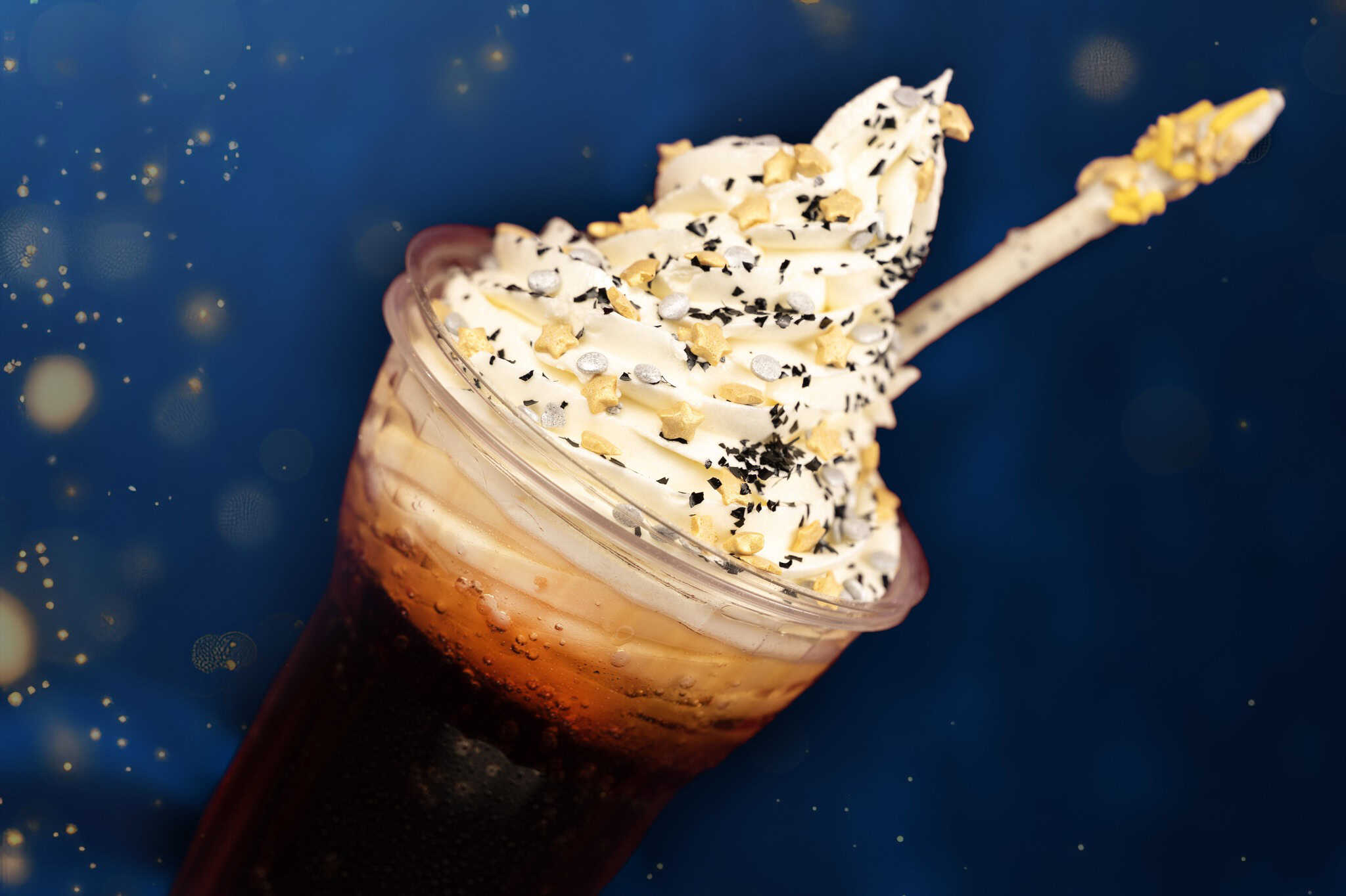 At Magic Kingdom, you can stop by Auntie Gravity’s Galactic Goodies in Tomorrowland for the Happy “Root Beer” Float. It’s a root beer with vanilla soft-serve, chocolate cookie biscuit sparkler, and shimmery sprinkles. This treat will be available now through January 3rd.