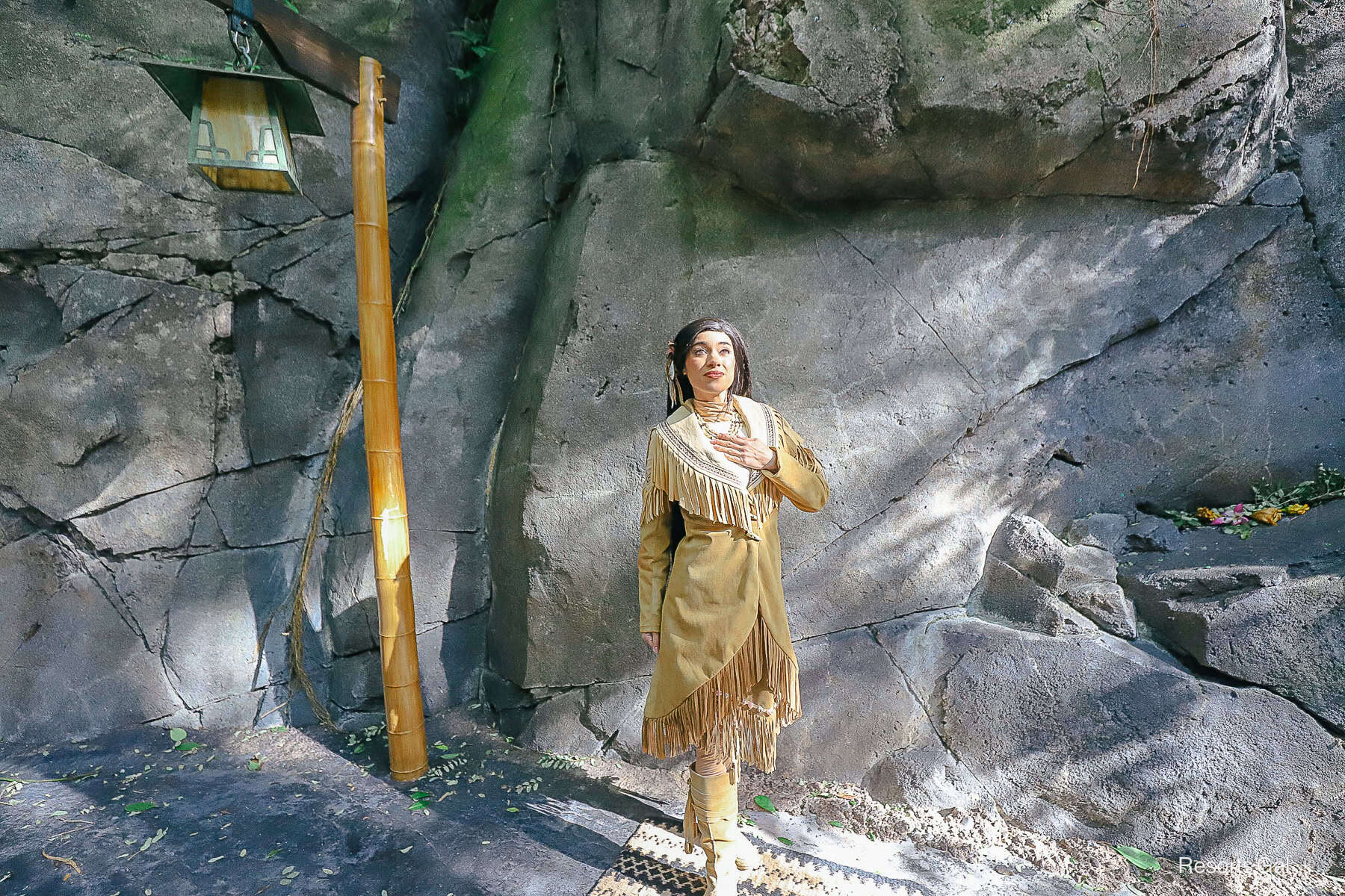 As an example, we recently saw Pocahontas meeting in The Oasis of Disney’s Animal Kingdom on a cold winter’s day. She was wearing a trench coat trimmed with lovely suede fringe that gave it a capelet look. She meets at this location on most days and often has a line.