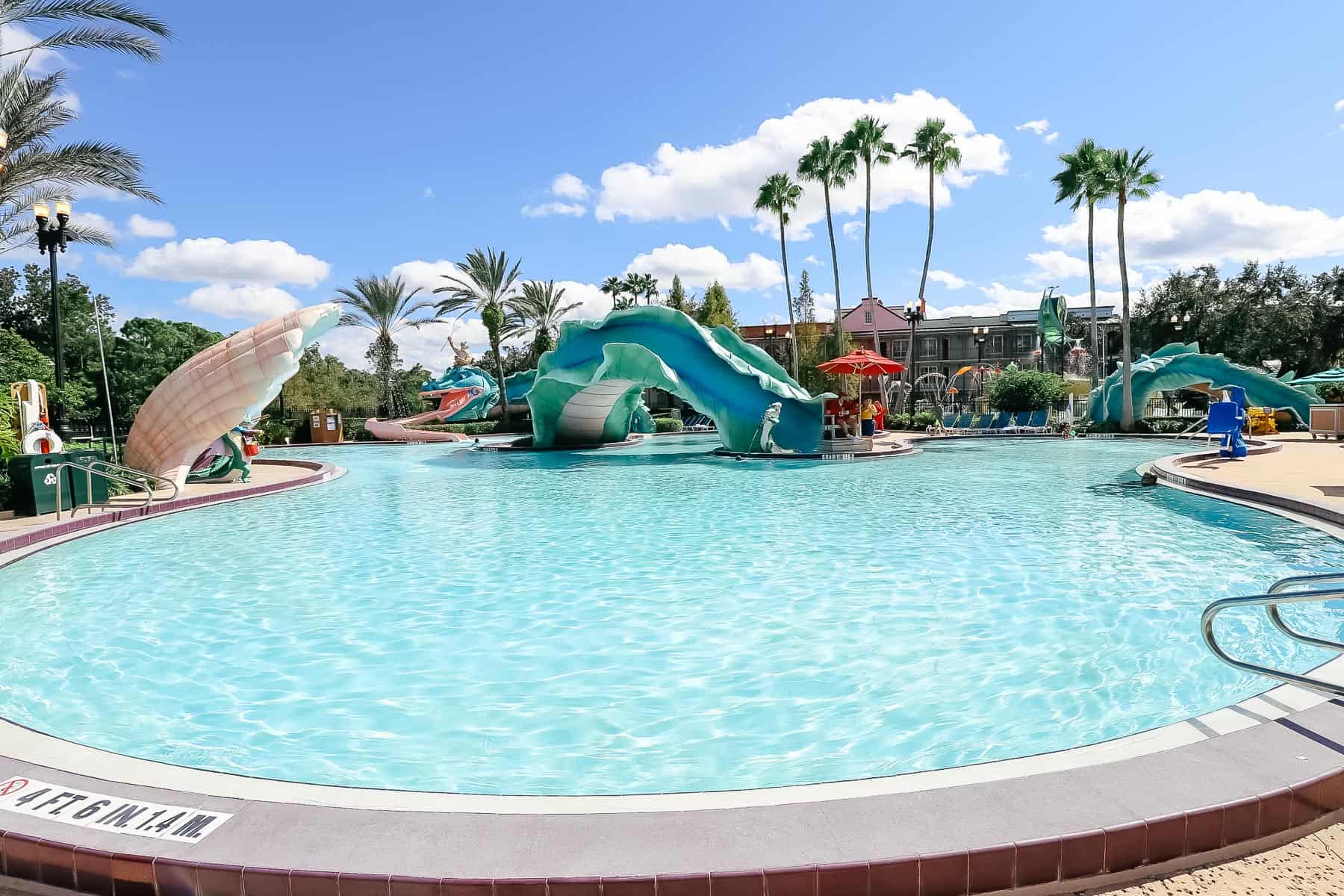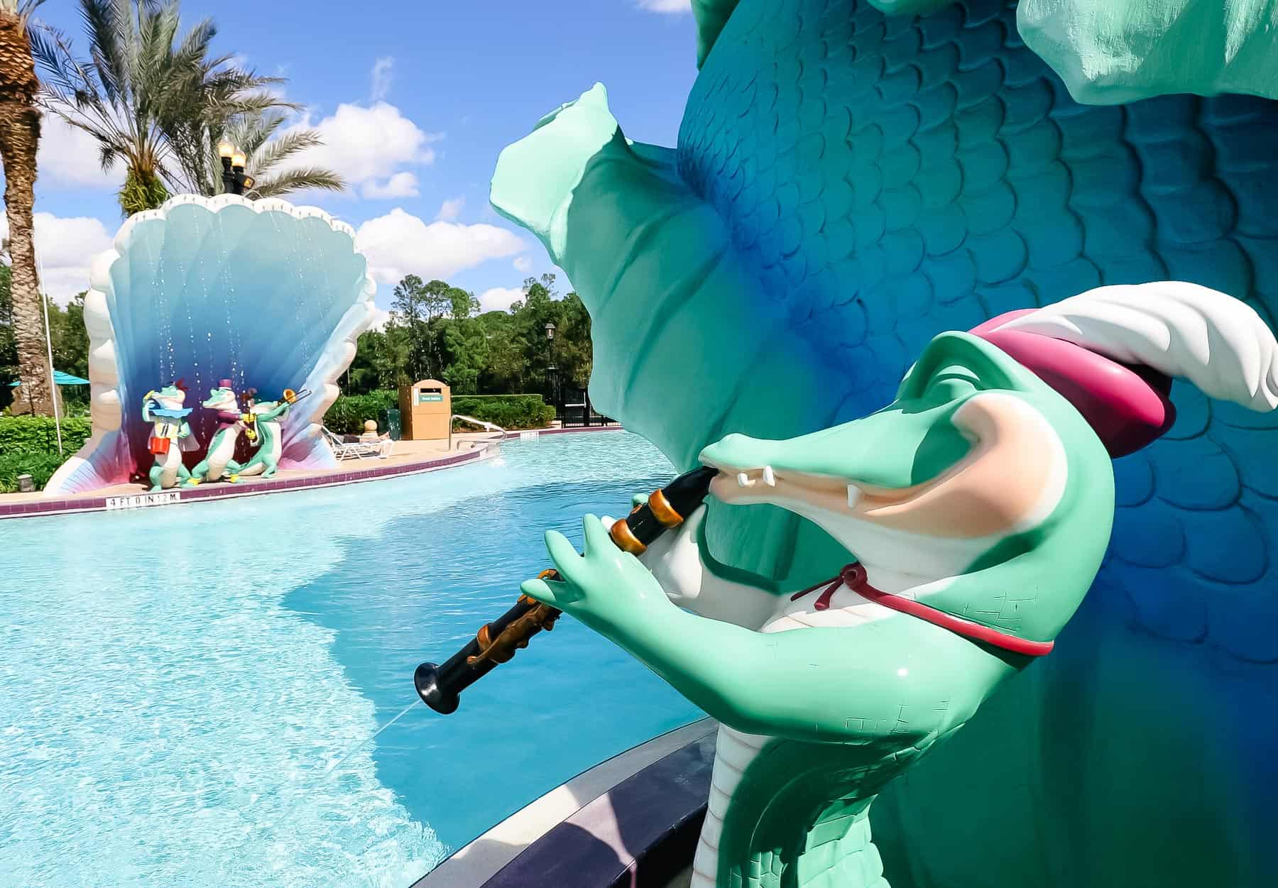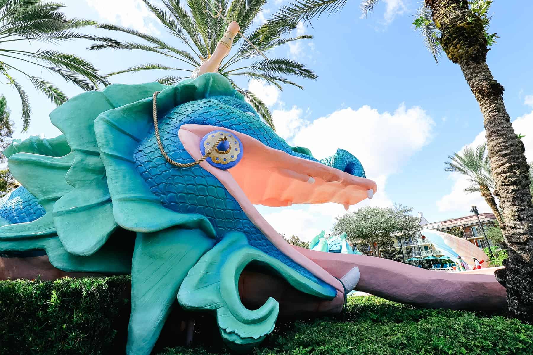 We’ve already discussed several nuances between Port Orleans French Quarter and the other moderate resorts at Disney World. Another significant difference is that the French Quarter only has one pool. That said, Doubloon Lagoon, the feature pool, is a fabulous pool unlike any other. A giant sea serpent named Scales straddles the length of the pool, forming bridges across it in certain areas.