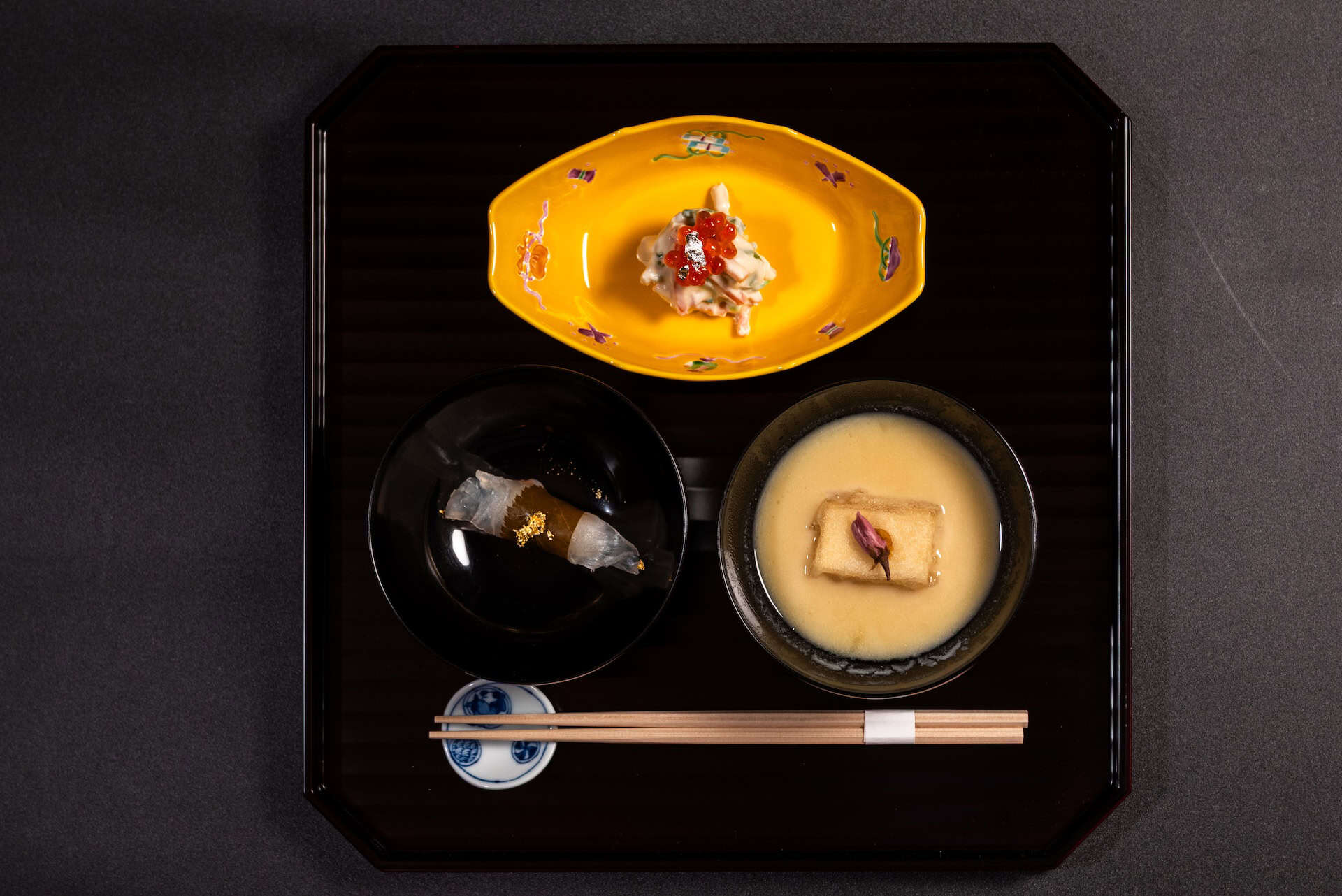 Per the menu: We start with ichiju sansai—one soup, two dishes—the foundation of Japanese cuisine. Inspired by the cha-kaiseki ritual of “four bowls,” this course invites you to open each lidded bowl at once and experience the beginning of your meal with all five senses. Seasonal ingredients and careful preparation set the tone for what’s to come.