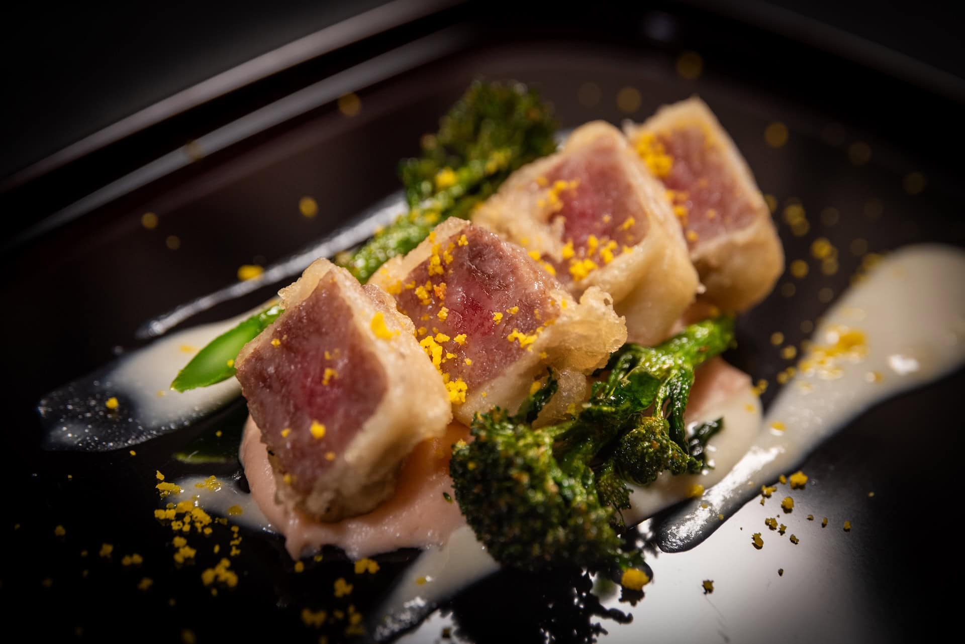 - Crisp Tempura of Japanese Black Wagyu with Sakura-infused mashed potatoes, tender broccolini, sweet sake velouté, and toasted egg crumble