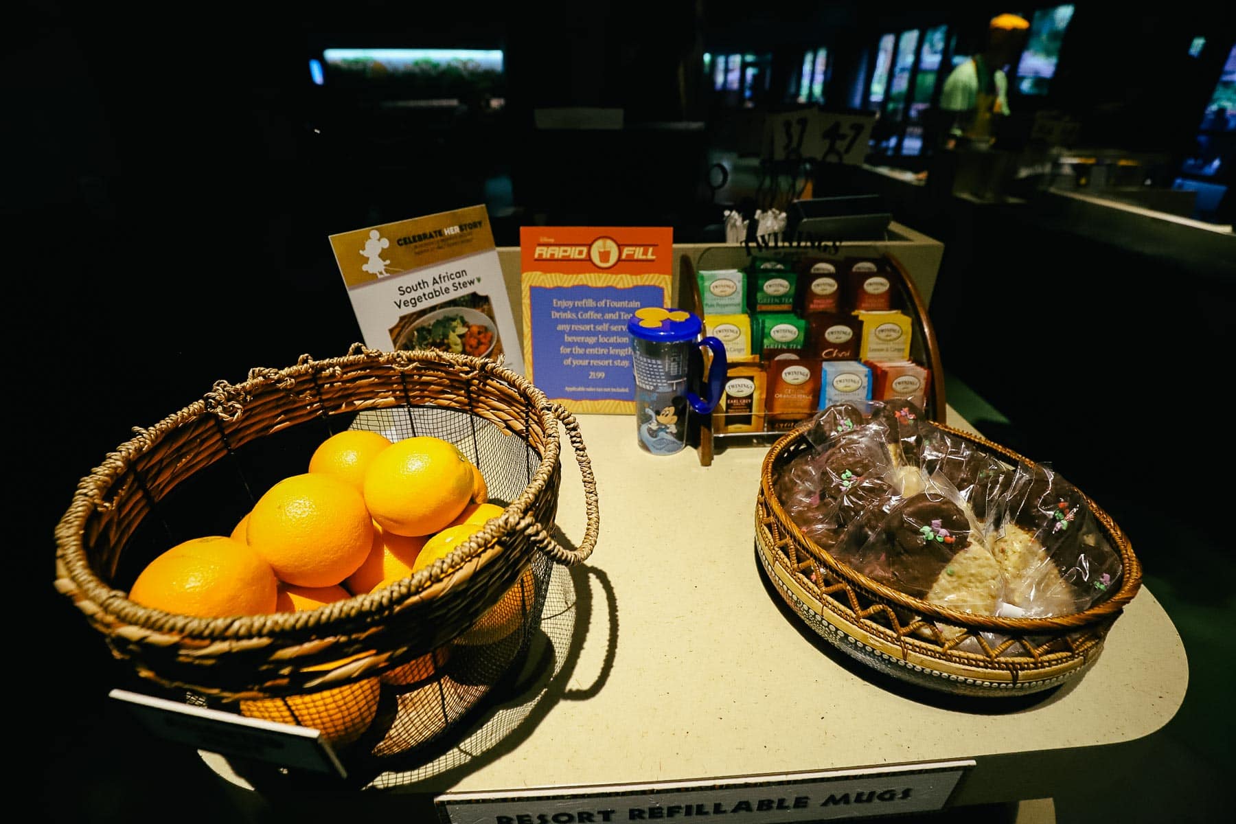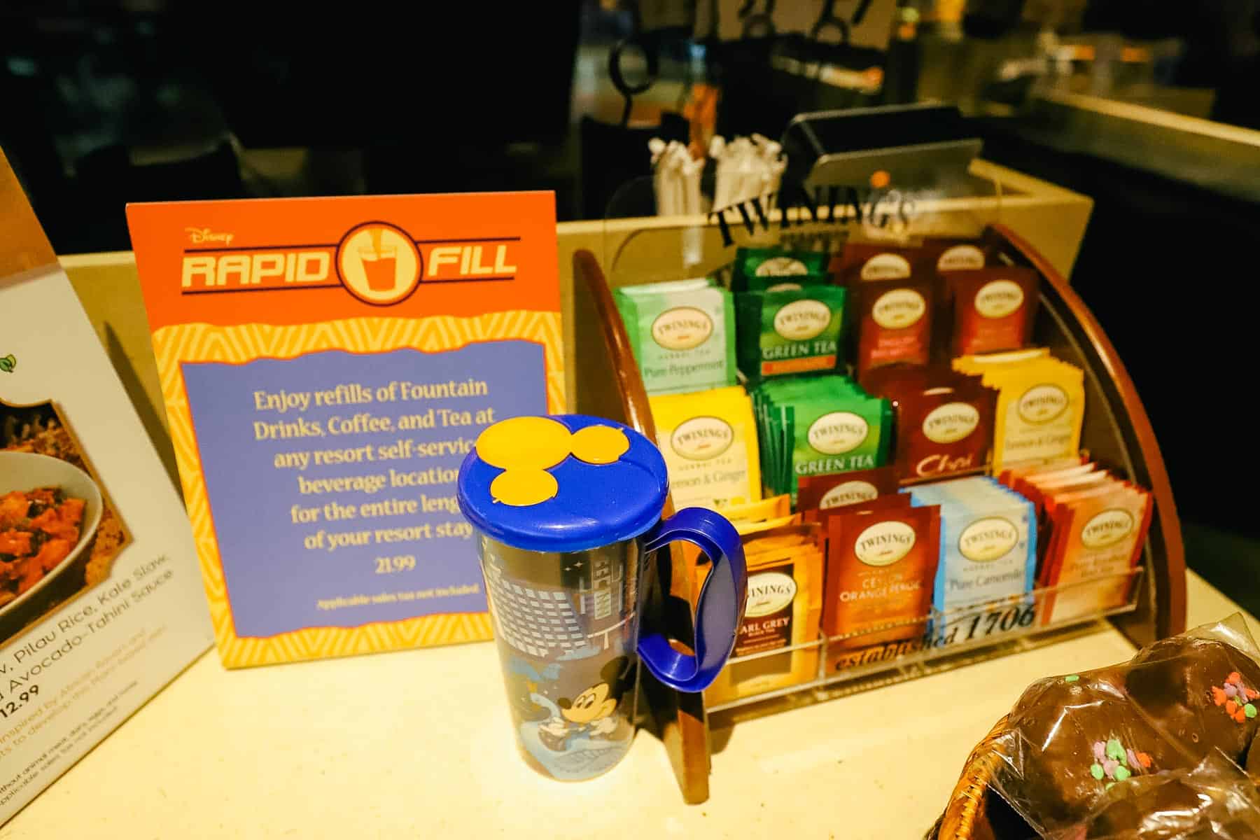 Rapid Fill mugs are available at the register. You can enjoy fountain drinks, coffee, and tea at any resort’s self-service beverage location for the length of your stay.