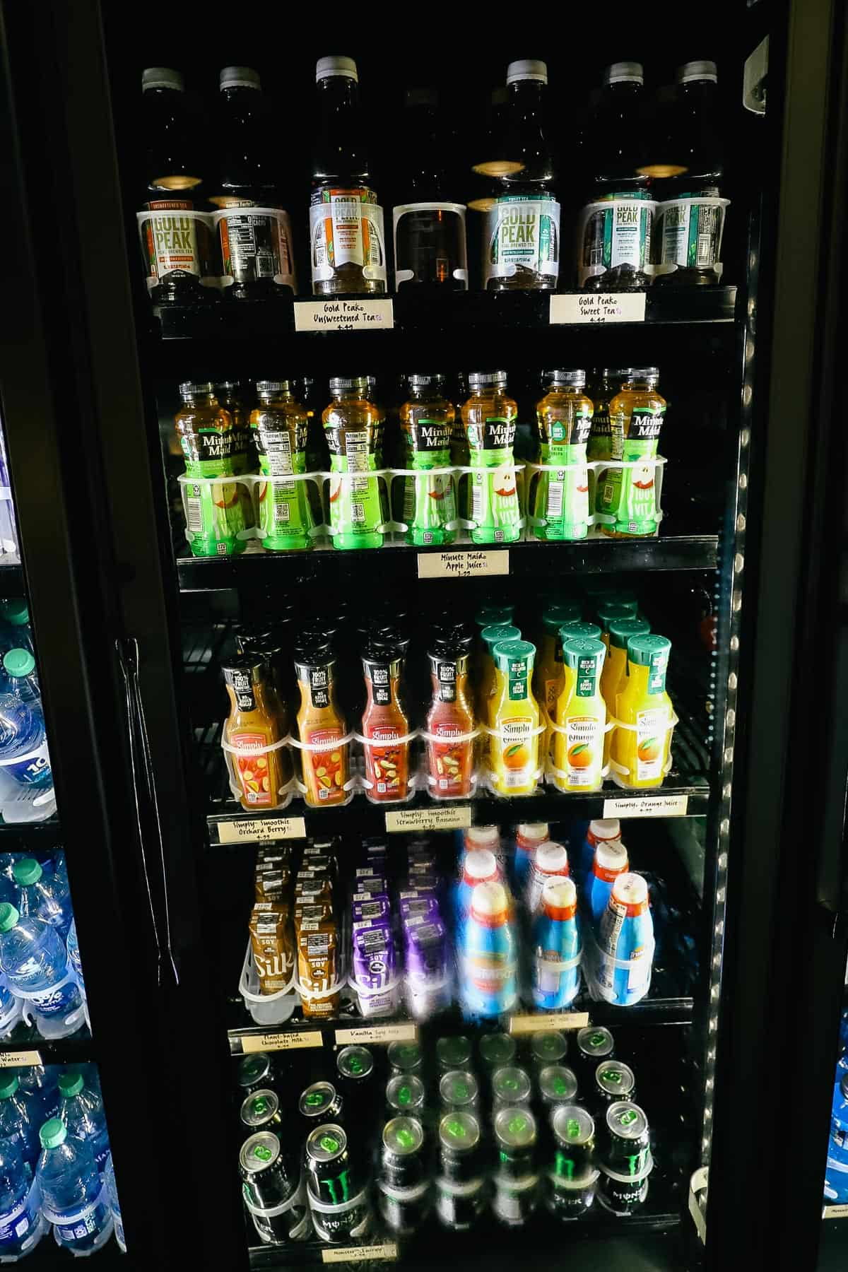 Next, there are teas, juice, milk, and energy drinks.