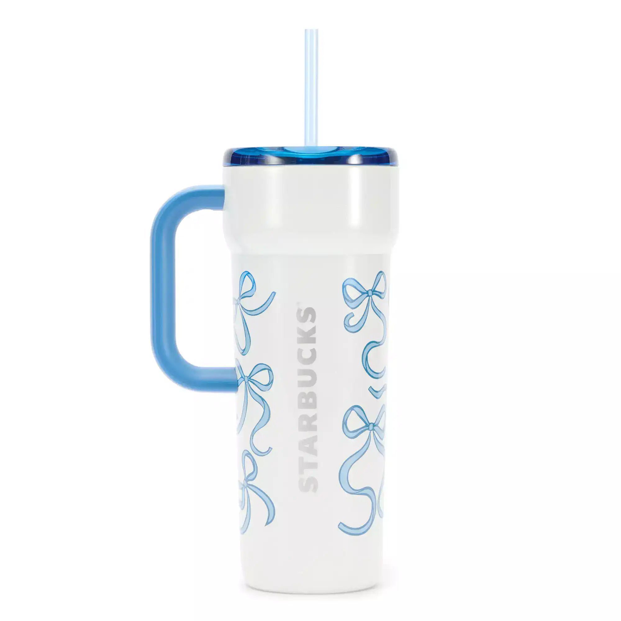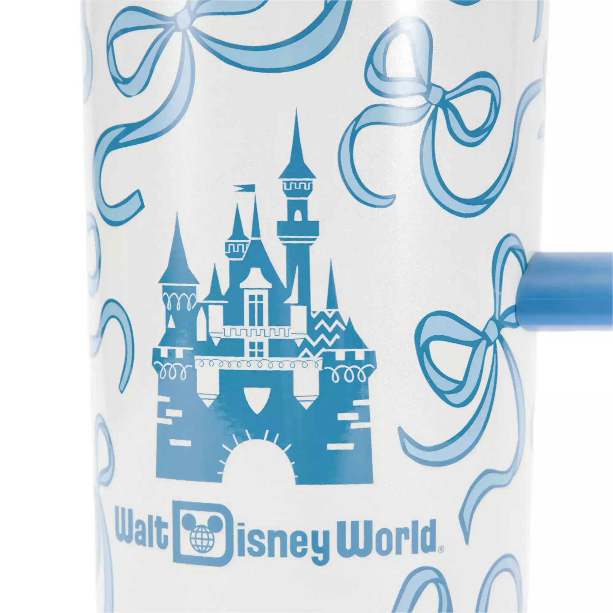 Next, we have the Walt Disney World 24oz Starbucks Stainless Steel Cup with Straw featuring the same blue bow pattern. The tumbler has a blue handle, platinum Starbucks logo, and plastic blue-shaded lid with a straw.