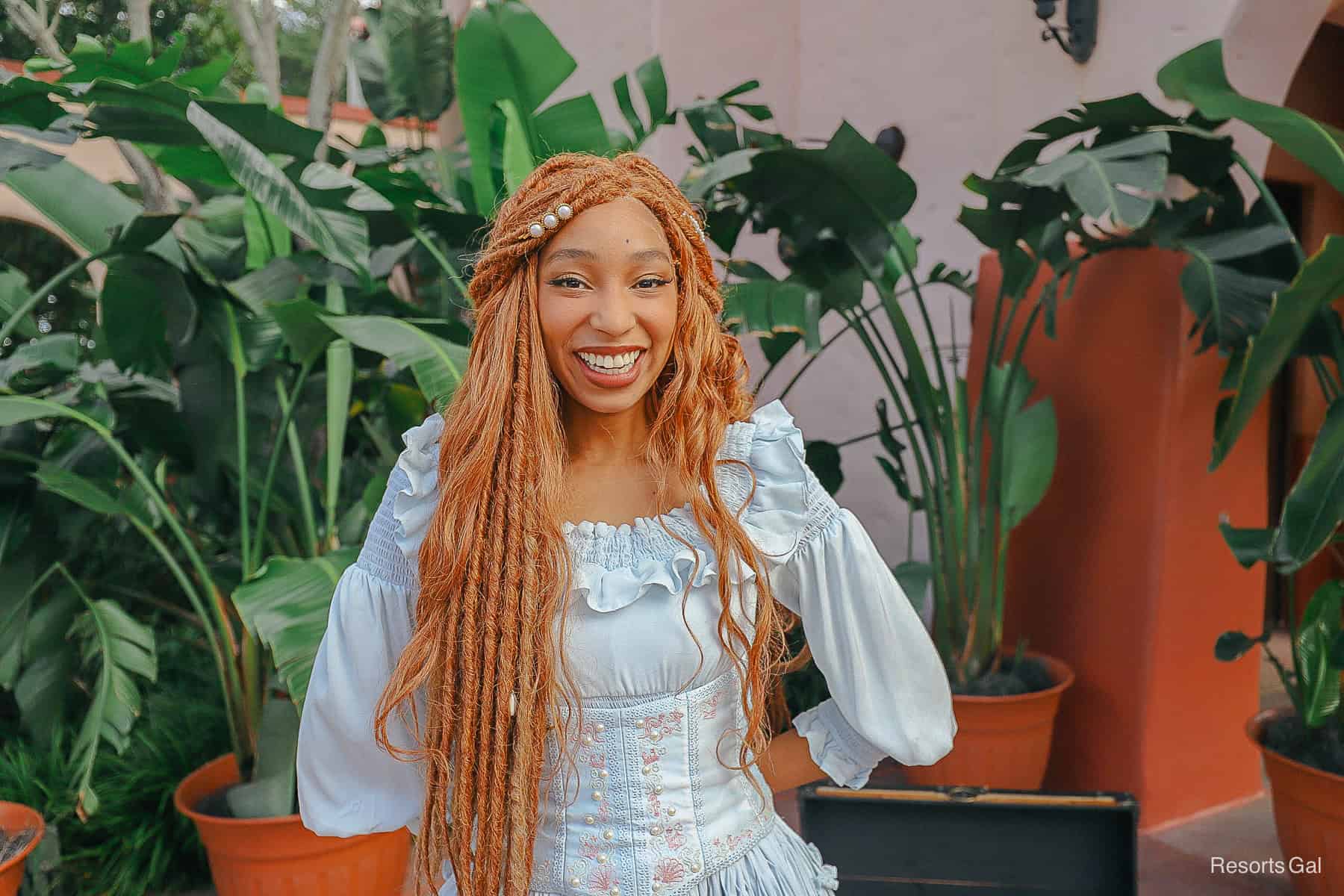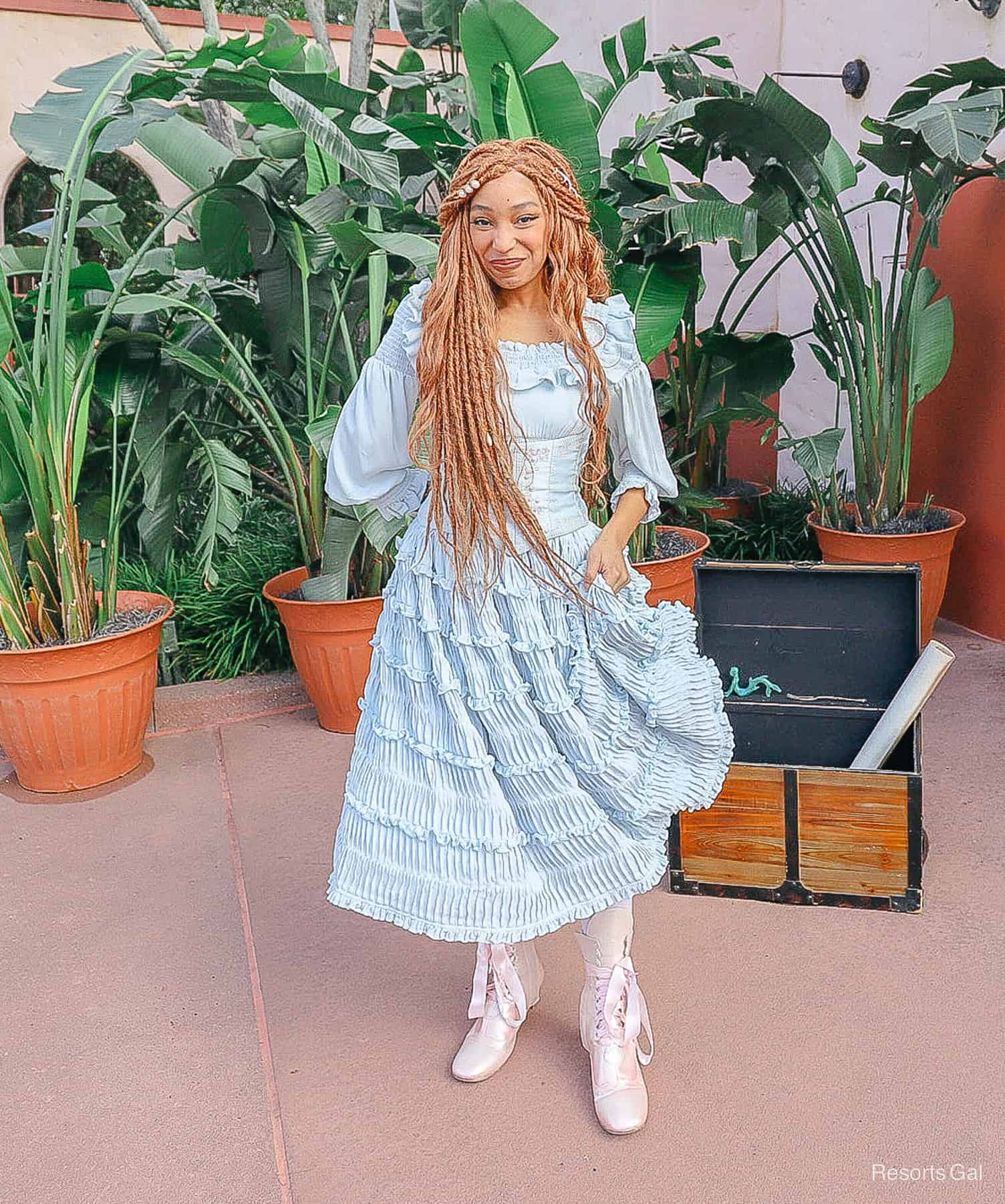 On a recent visit to Disney’s Hollywood Studios, we stopped by to meet Ariel and check out her new location. She wears her light blue land dress from the live-action film at this location.
