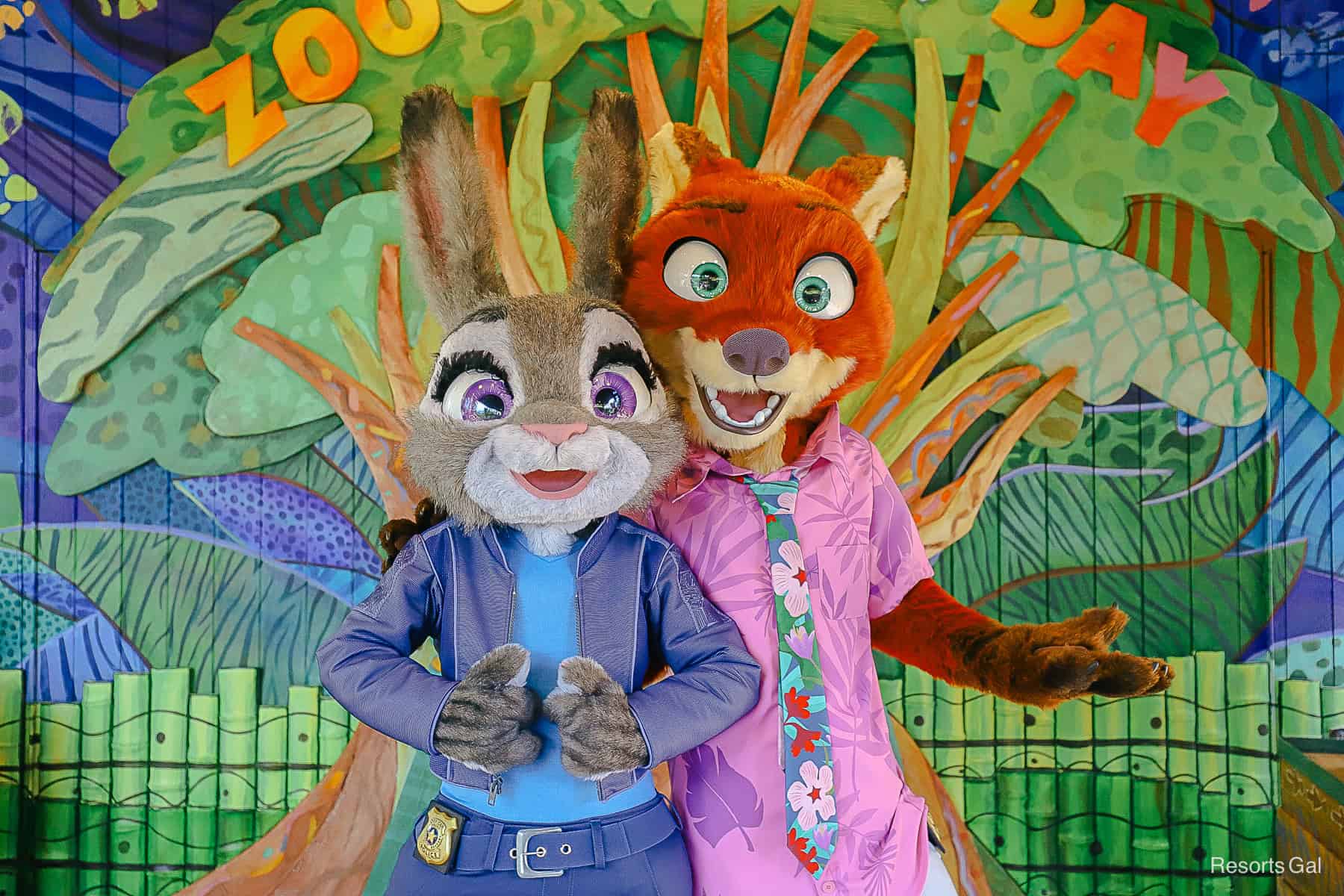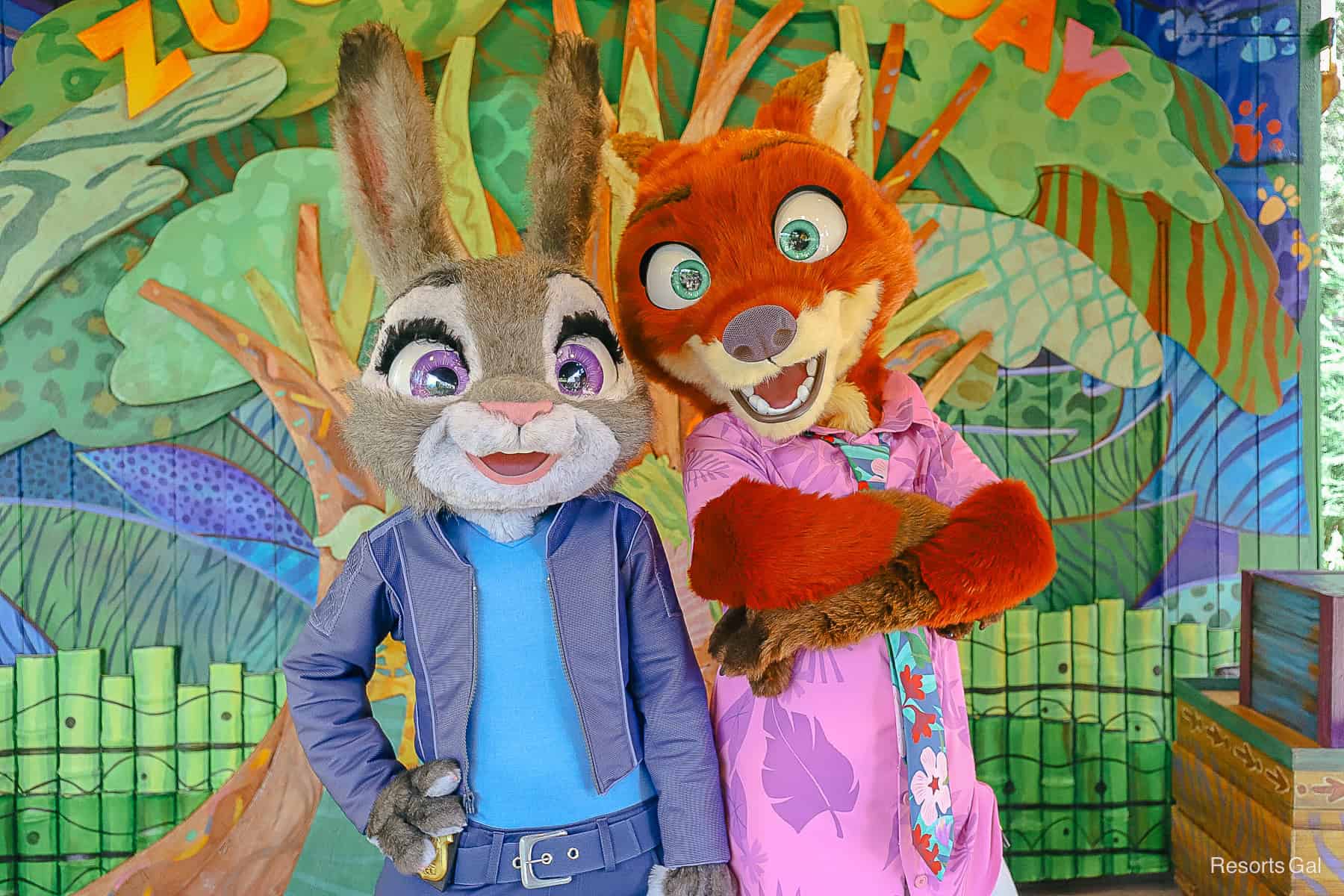 Judy Hopps and Nick Wilde meet guests daily at Disney’s Animal Kingdom. They meet intermittently throughout the day on Discovery Island at a location called the Zoogether Day Gathering Spot. This meet-and-greet is immediately next to the entrance of Zootopia: Better Zoogether. It was formerly the Wilderness Explorer’s Clubhouse, where Dug and Russell from Up met. They have since moved to a meet-and-greet location on Discovery Island Trail West.