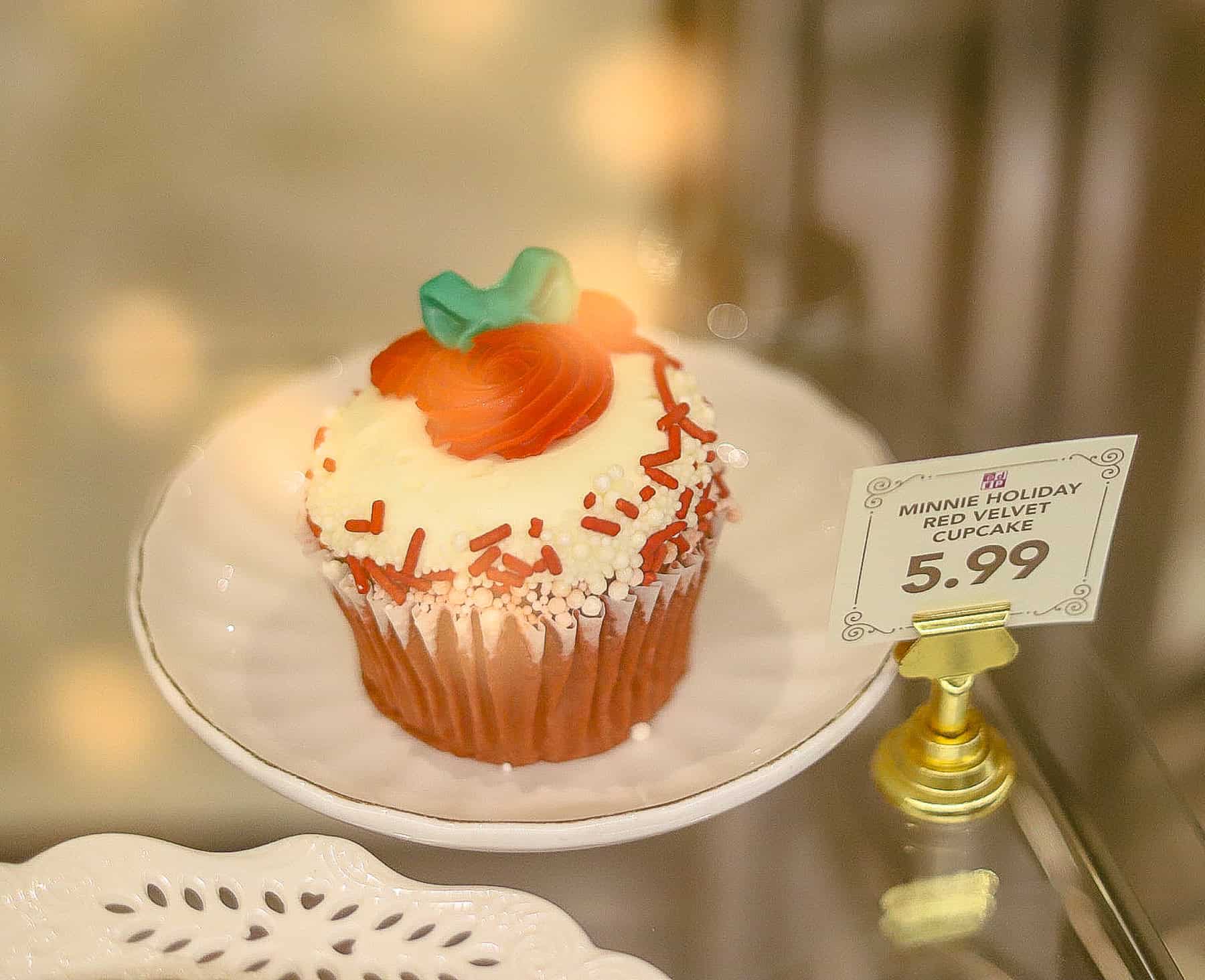 - Minnie Holiday Red Velvet Cupcake $5.99: Red velvet cupcake with buttercream, frosting, sprinkles, and green chocolate bow.