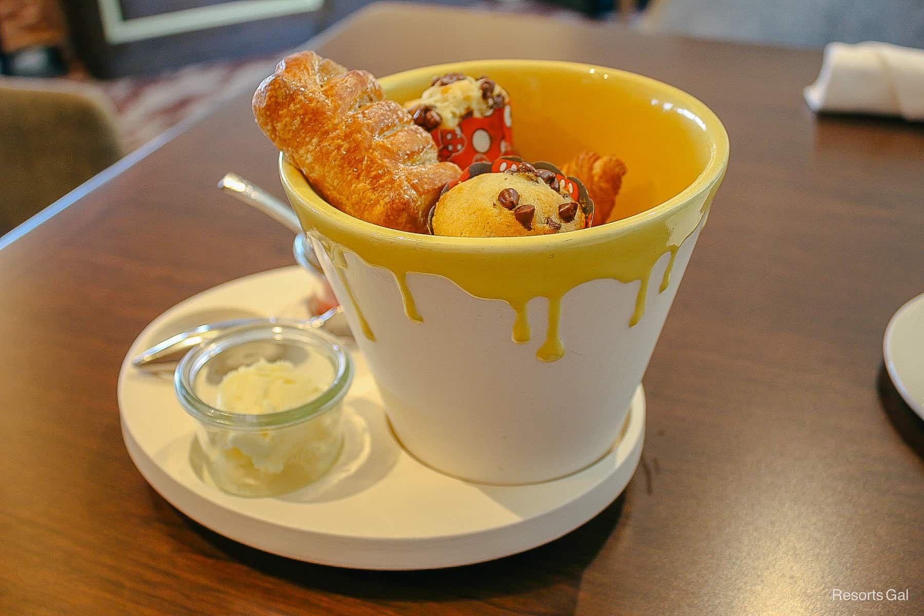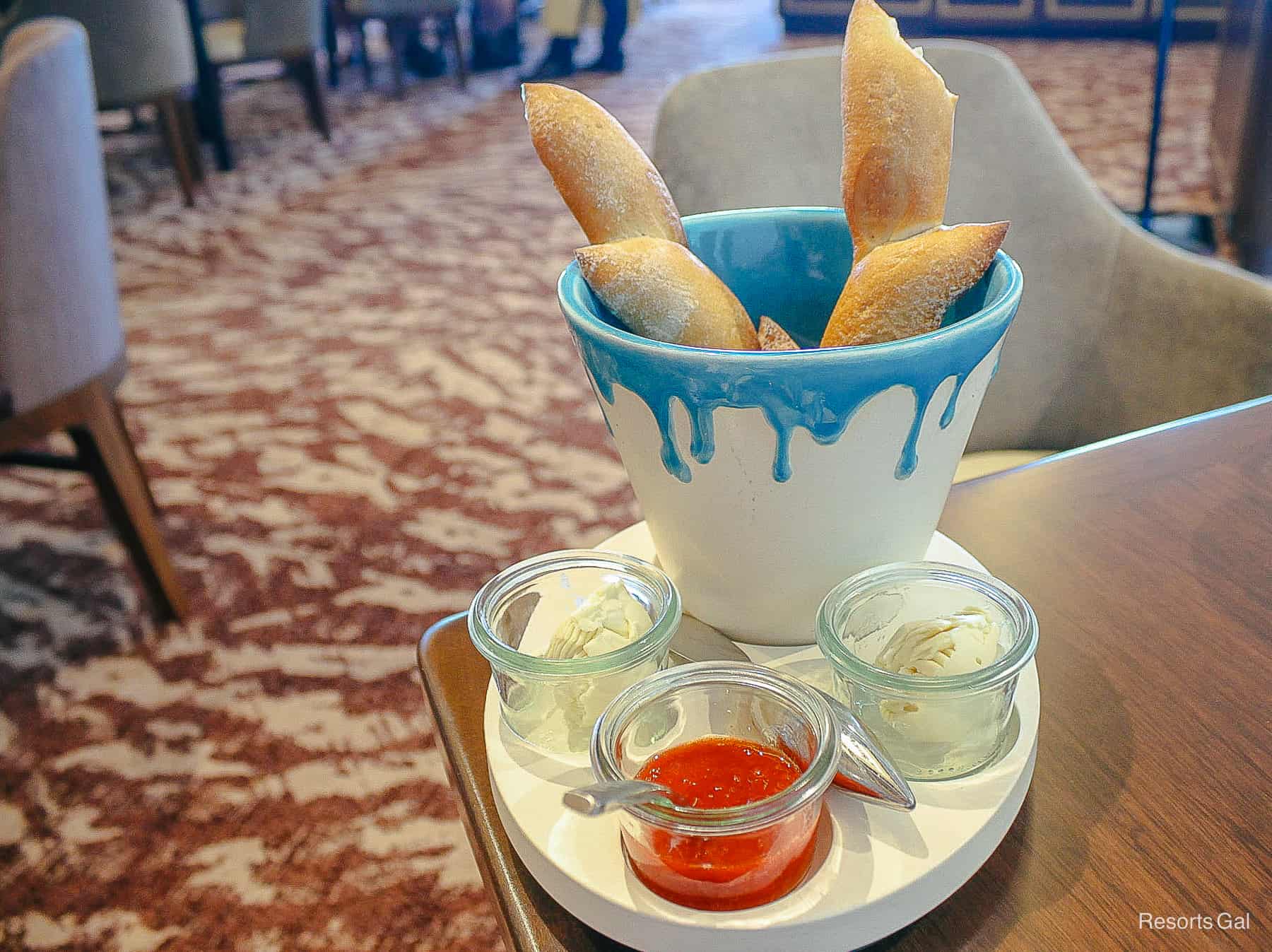 Breakfast begins with an assortment of pastries. Since my son has food allergies, he was brought a separate paint bucket. It contained special breadsticks with allergy-friendly spreads. They were shaped like the popular French Epi bread.