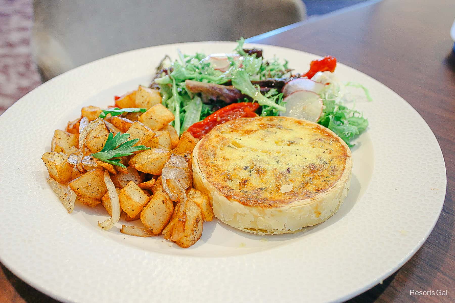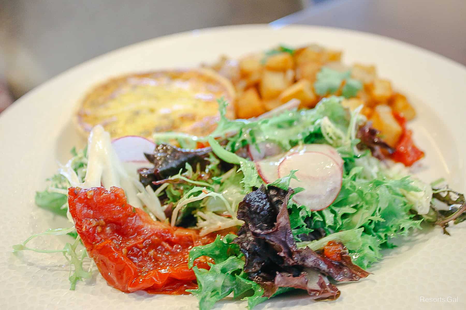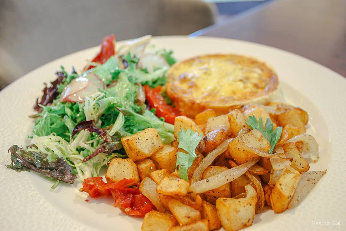The quiche came with a fresh watercress salad and a side of roasted potatoes.