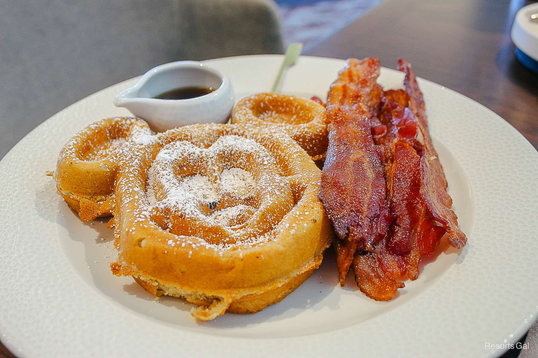 He ordered the sour cream waffle with a side of bacon. This was prepared with an allergy-friendly mix that doesn’t contain eggs or dairy. It is similar to what a normal guest will receive when ordering the adult sour cream waffle with a side. The chef uses a special waffle iron to prevent cross-contamination. It didn’t hurt that it doubled as a Mickey waffle.