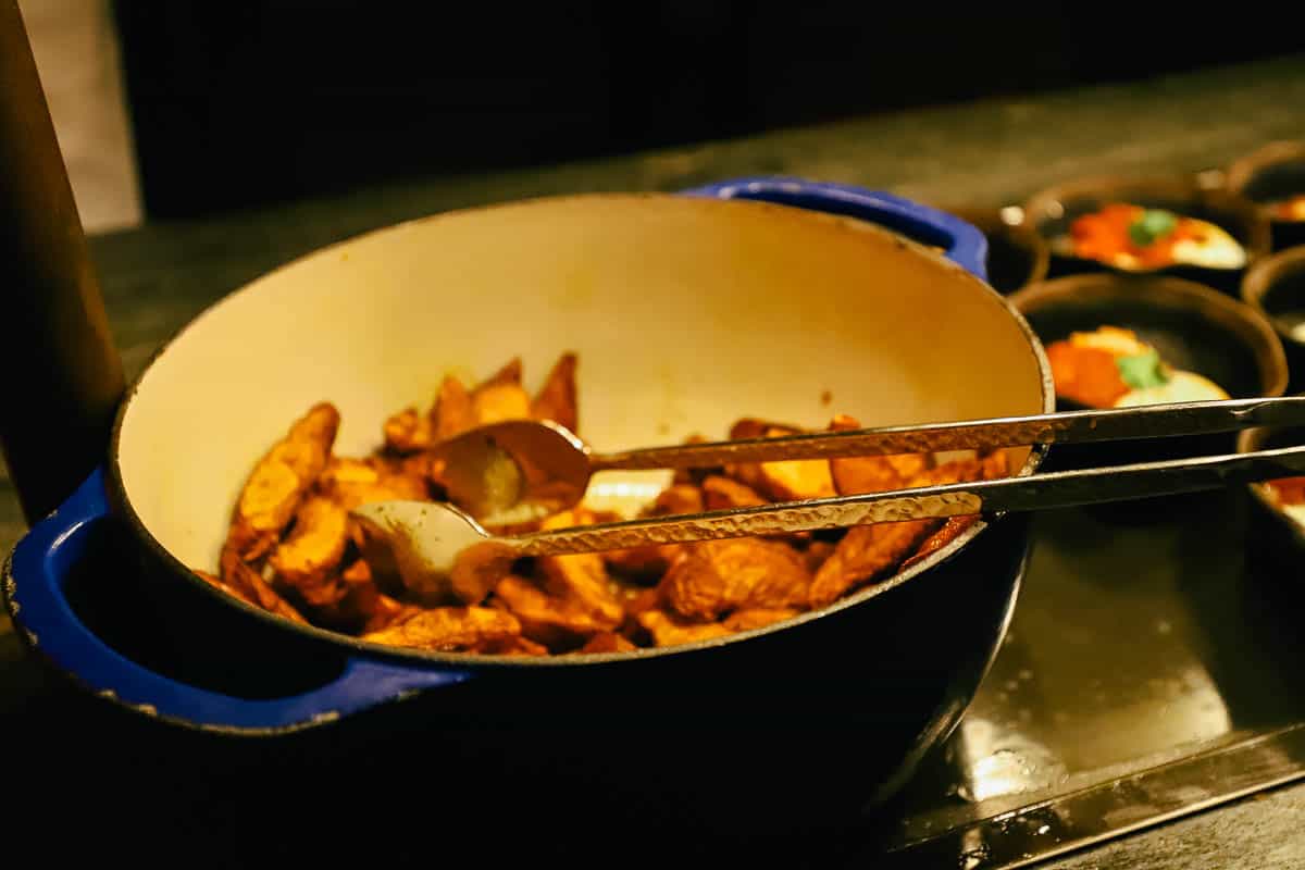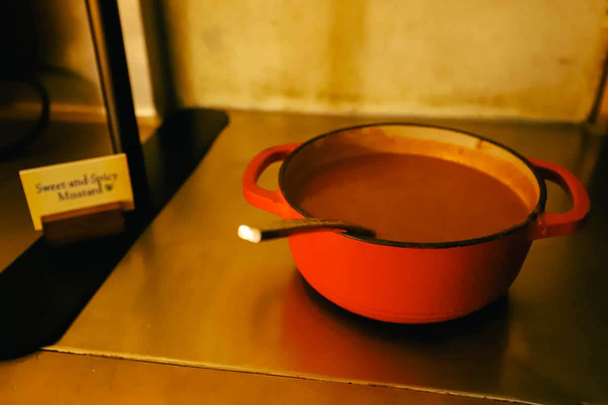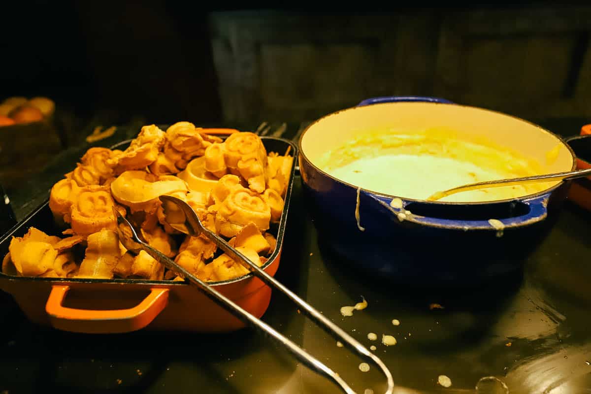 Before we get to the end of the buffet, we run into more Mickey Waffles. You can never have enough Mickey in your life. Next to the waffles, we see a large Dutch oven with Mealie Pap and Chakalaka. This dish is similar to grits. However, our version was much runnier.