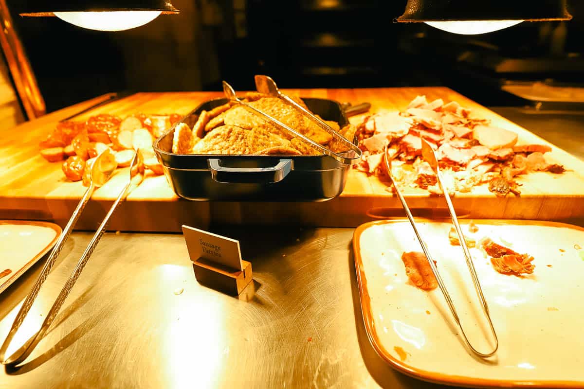 Of course, anyone can grab a bite from the children’s area and vice versa. Below we see potato tots, sausage, and bacon.