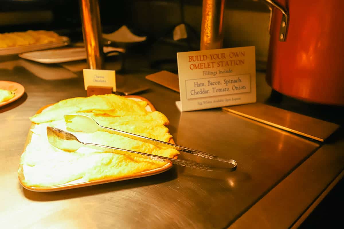 At the very end of the buffet, there were cheese omelets available. Additionally, there was the option for a build-your-own omelet. Fillings include ham, bacon, spinach, cheddar, tomato, and onion.