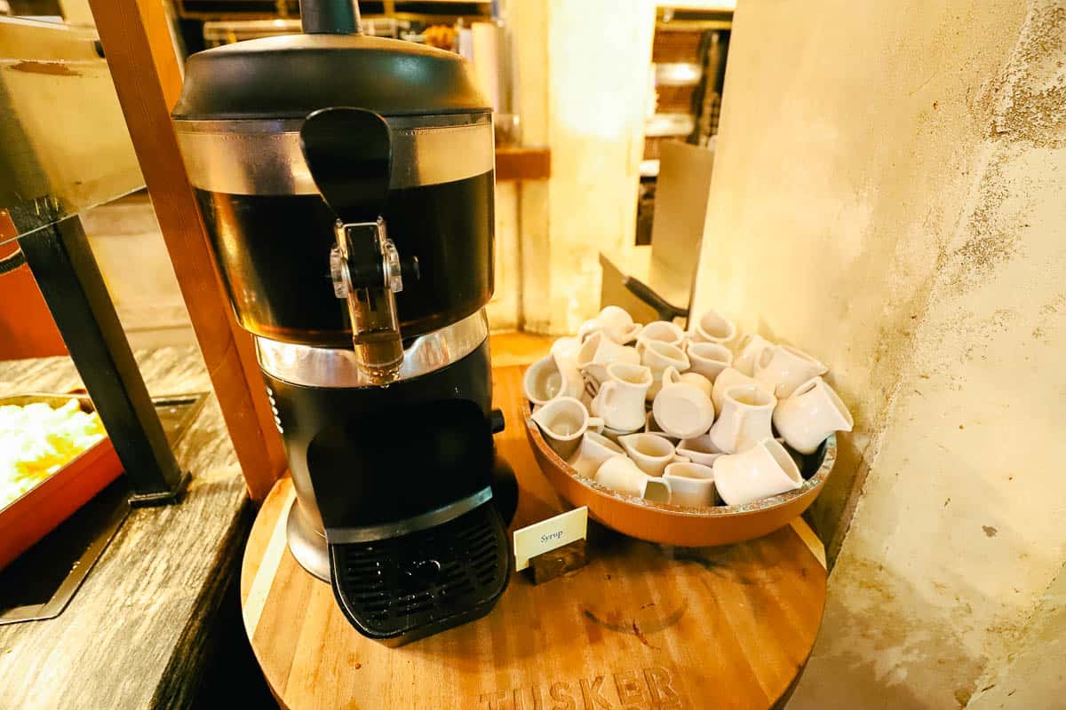 Also, there’s a dispenser with syrup for the pancakes and waffles.