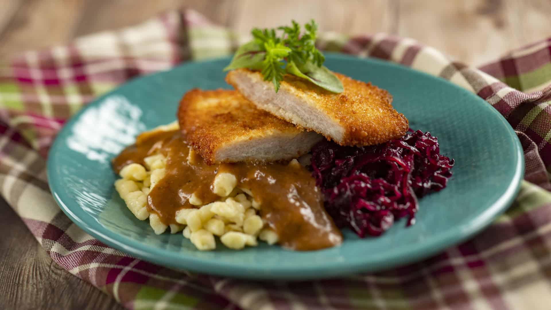 - Pork Schnitzel with mushroom sauce, spätzle, and braised red cabbage