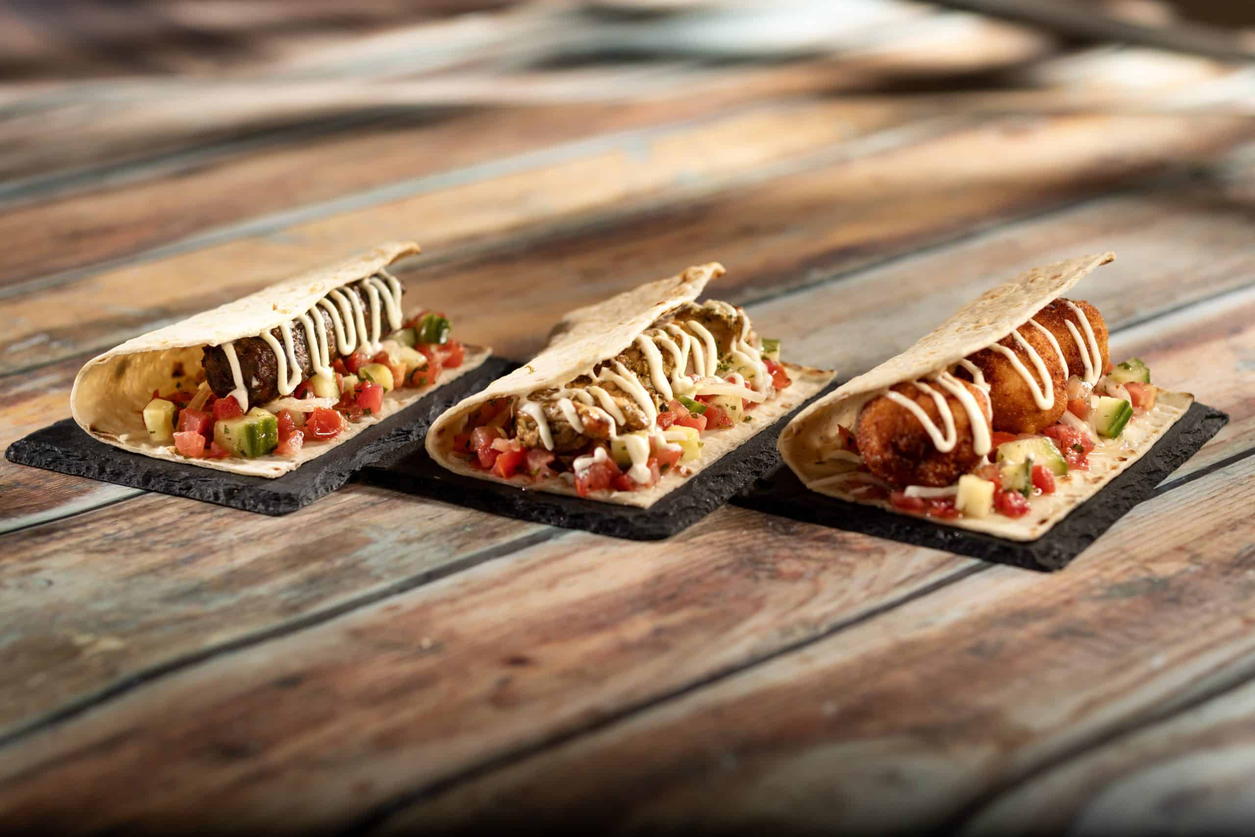 - Moroccan Wrap with tomato-cucumber relish and garlic sauce served on warm Moroccan flatbread