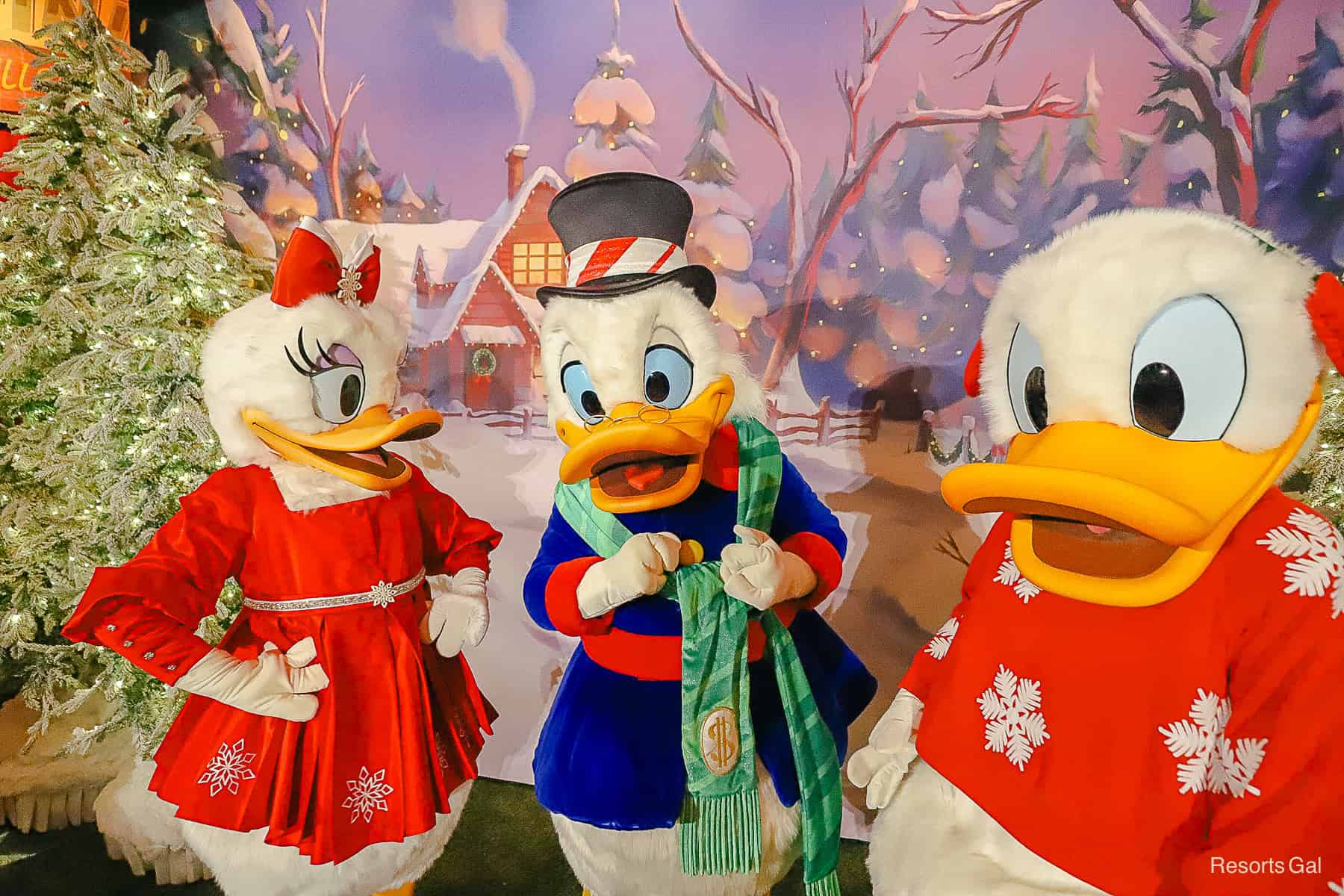 Donald, Daisy, and Scrooge meet in front of a canvas backdrop that’s painted to look like a snowy Christmas cabin scene. The cabin is covered in snow and holiday trim with flocked trees on both sides.