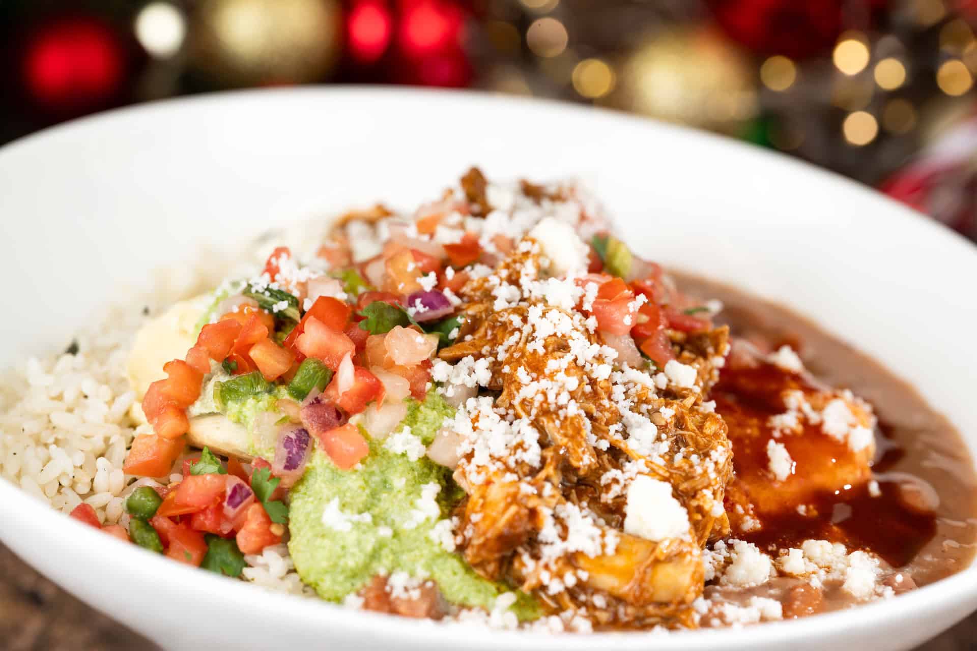 - “Christmas-style” Chicken Tamale with mild red chile sauce and pumpkin seed salsa verde, cilantro rice, pinto beans, and queso fresco (Available during Mickey’s Very Merry Christmas Party only)