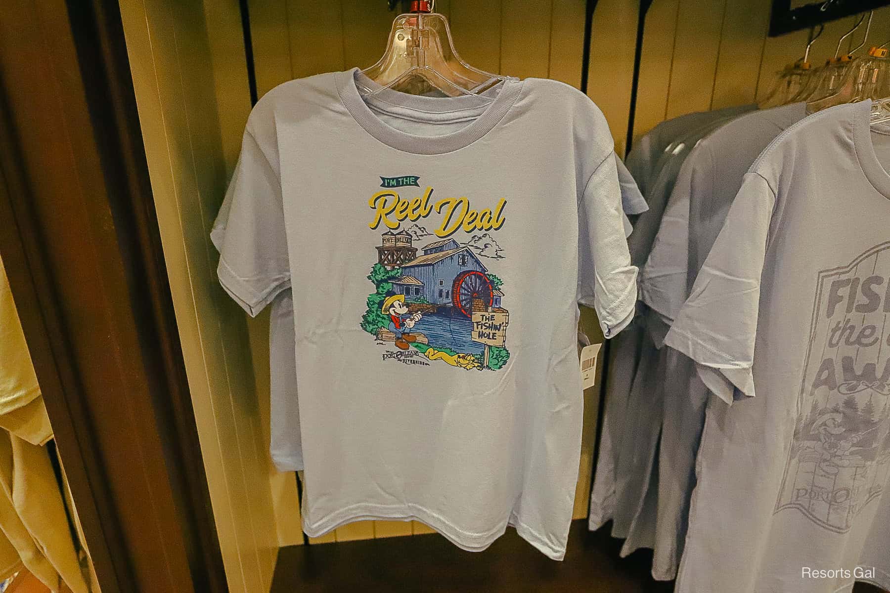 Then, we have a close-up of the “I’m the Reel Deal,” Port Orleans Riverside children’s t-shirt with Mickey Mouse fishing in front of the water wheel.