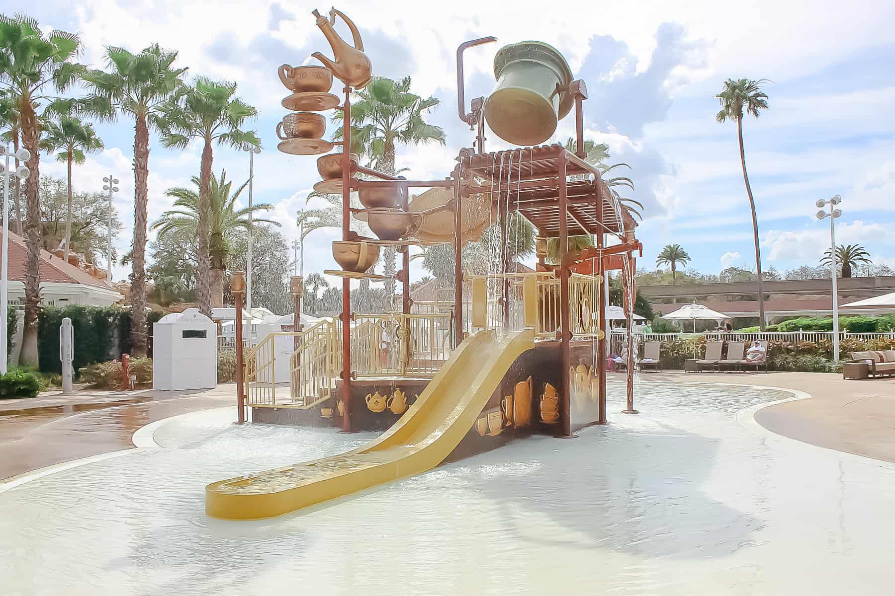While the Riviera Pool has sophistication, the pool also has one of the best aquatic play areas for children. It’s too cute, with a twisty slide similar to the larger one in the main pool. This water play area is themed to Fantasia.