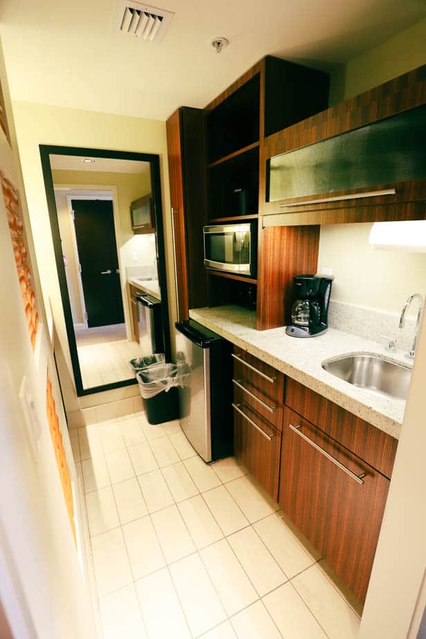 Additionally, the guest bath on the studio side of the room is much smaller. It’s because the kitchen takes a ton of square footage away from both the bath and the guest room.
