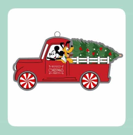 The ornament features Mickey Mouse and Pluto in a red pickup truck, carrying a Christmas tree! The wheels are peppermint, and the truck’s door panel says Mickey’s Very Merry Christmas Party.