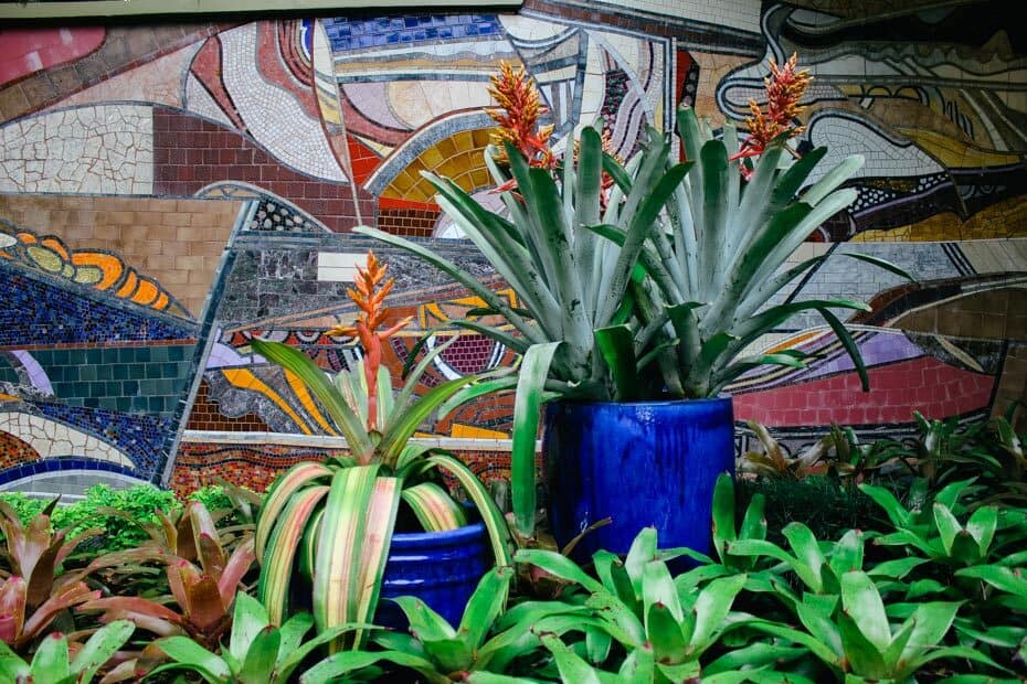 As you approach the Land Pavilion’s entrance, you will notice the beautiful tile mosaics on each side of the walkway. Both murals are identical except for one tile. The murals were designed by Walt Peregoy and installed by Hanns-Joachim Scharff and Monika Scharff. (They are also responsible for the Cinderella murals that line the halls of Cinderella Castle.)