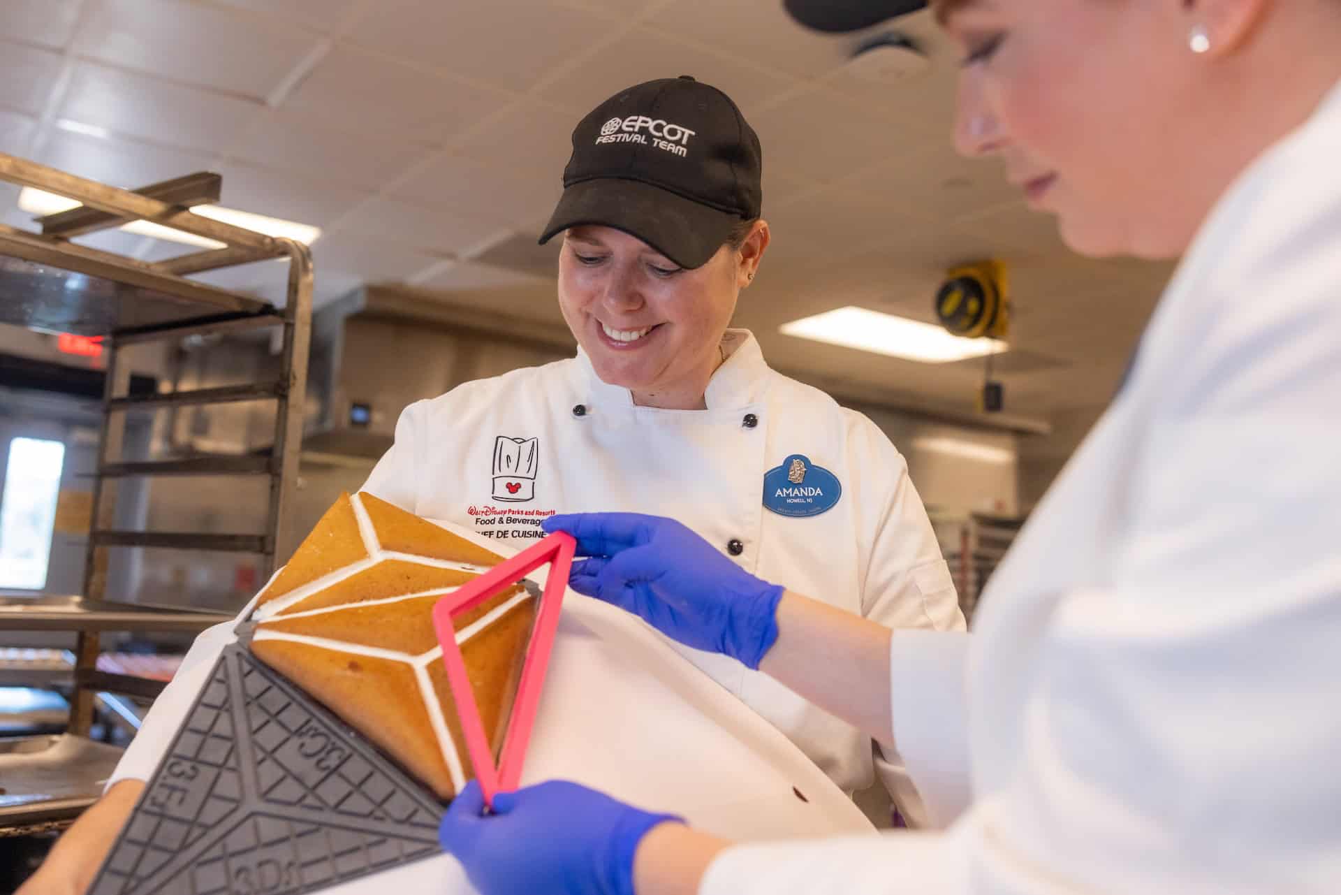 The EPCOT Festival Team and Walt Disney Imagineering have teamed up with the talented EPCOT Pastry team to create this 8-foot-tall gingerbread display, which took over 160 hours. It will even light up and dance to music throughout the day. The sphere itself is made up of almost a thousand handcrafted gingerbread triangles to mirror the iconic attraction. There are 240 pounds of honey dough, 100 eggs, 100 ounces of lebkuchen spice, 55 pounds of dark chocolate, and 100 pounds of royal icing. For a final Disney touch, there are 11 hidden Mickeys to represent the 11 countries of the World Showcase.