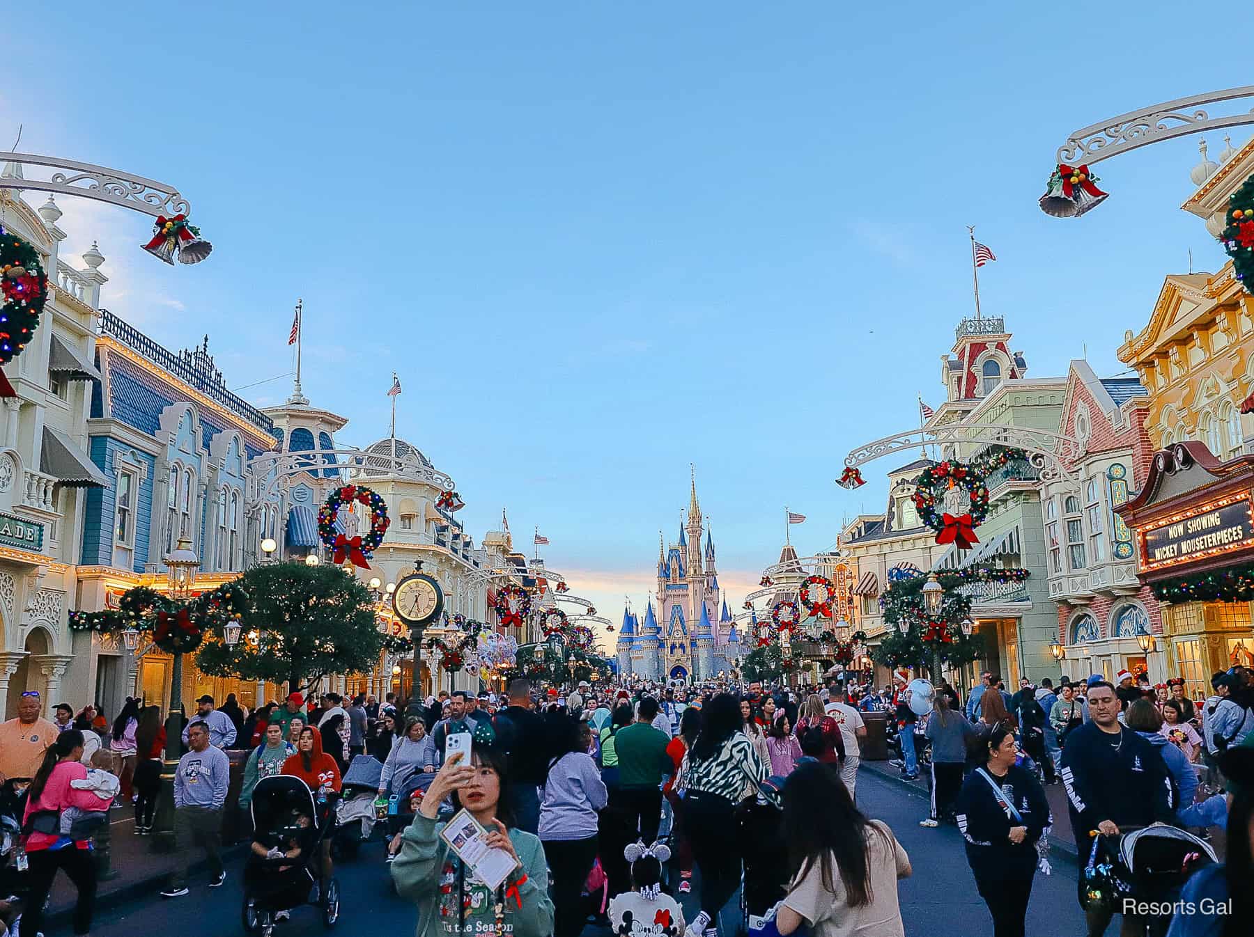 For those following along, you know we’ve been on a walking tour around Magic Kingdom to check out this year’s holiday decorations in Fantasyland, which feature a nod to several favorite attractions. We also admired the charm of this season’s decorations in Liberty Square and Frontierland. For this post (and it’s a long one), we’ll take a look at 50+ photos of the Christmas decorations on Main Street. U.S.A., from the park’s entrance all the way to Cinderella Castle. I hope you enjoy them!