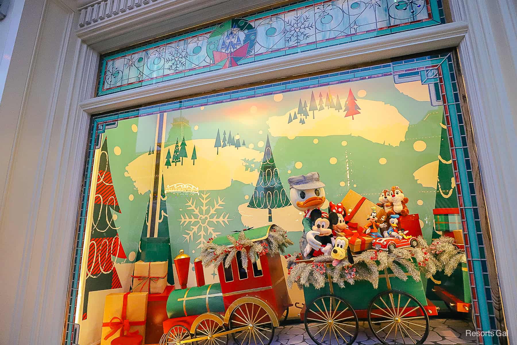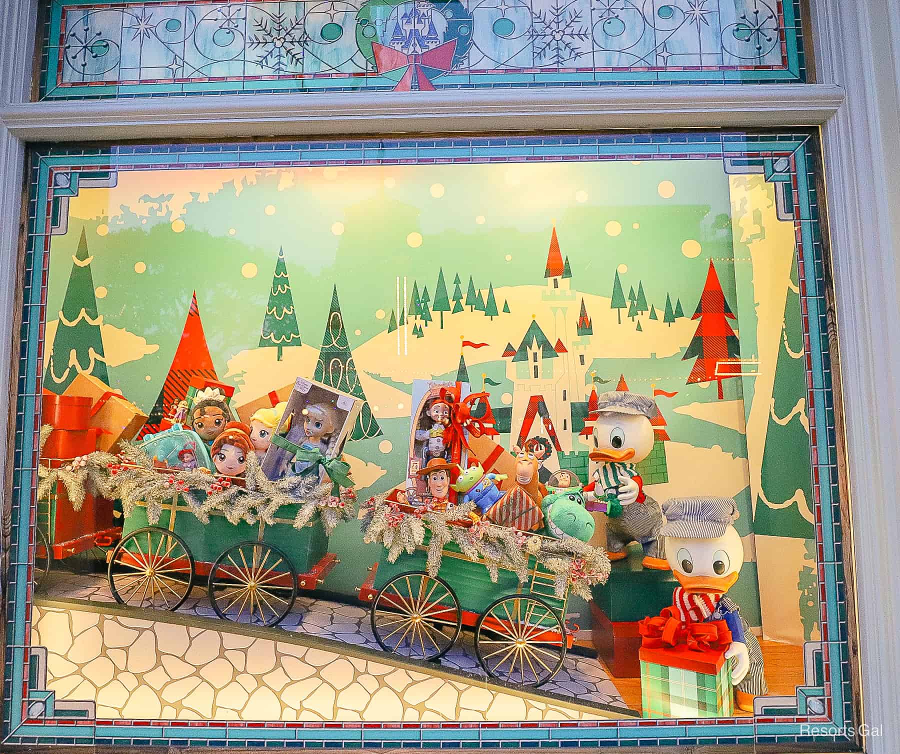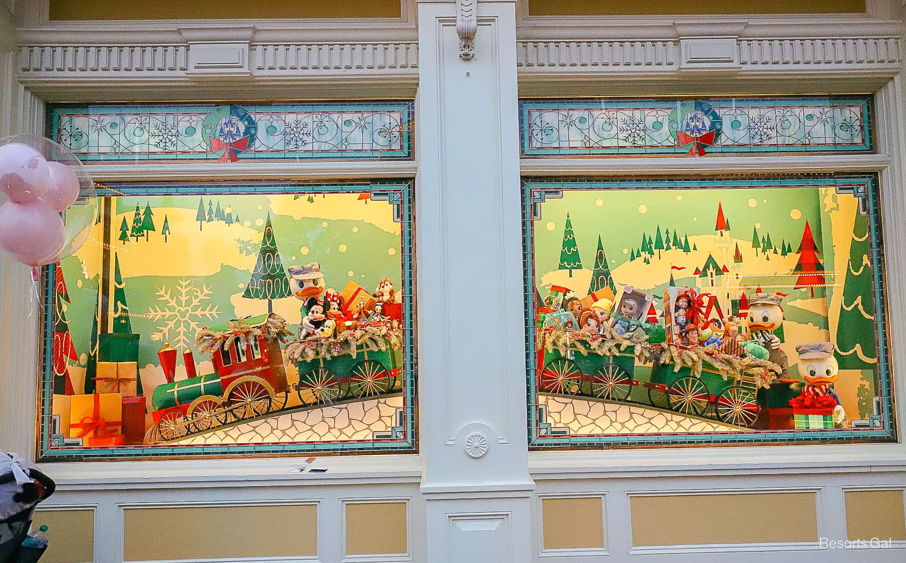 Another window shows Donald’s nephews loading up a train with toys. These are a little easier to see in the evening when there’s less of a glare.