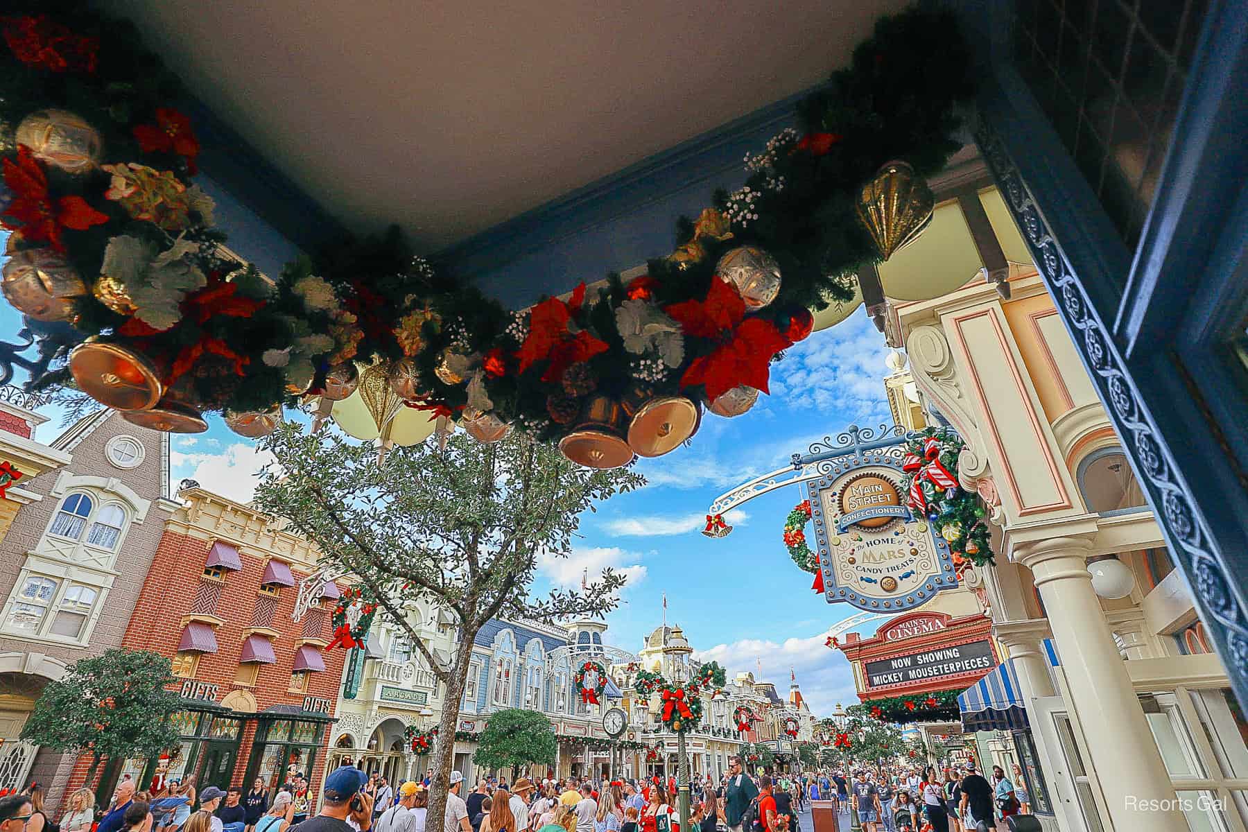 The somewhat zoomed look is always nice because it allows a closer look at how all those wreaths line the entire street. Bells hang above each one.