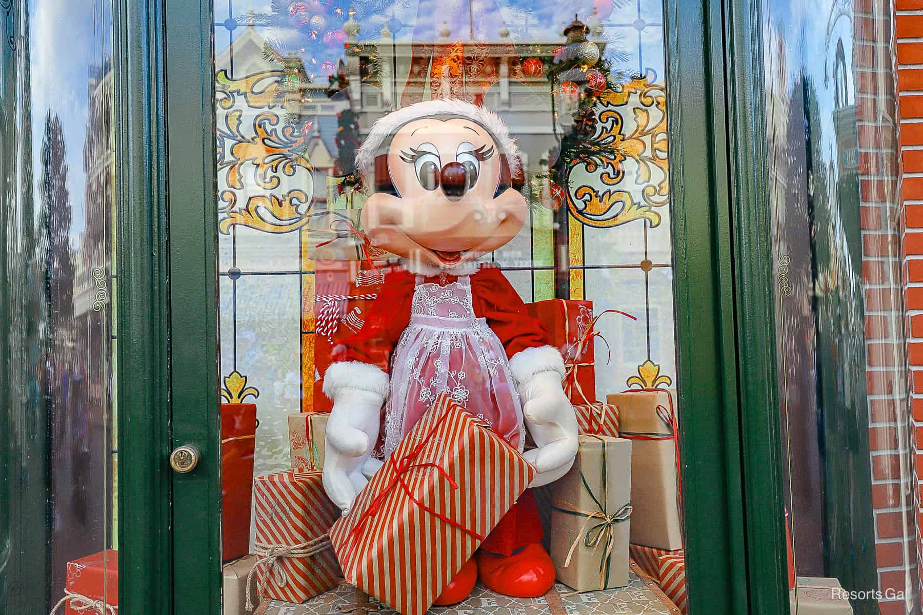You’ll find a variety of holiday window displays up and down Main Street. Around the Emporium, you can enjoy the story of Disney’s version of A Christmas Carol. Each window features a significant scene. We found Mickey and Minnie Mouse in other displays.