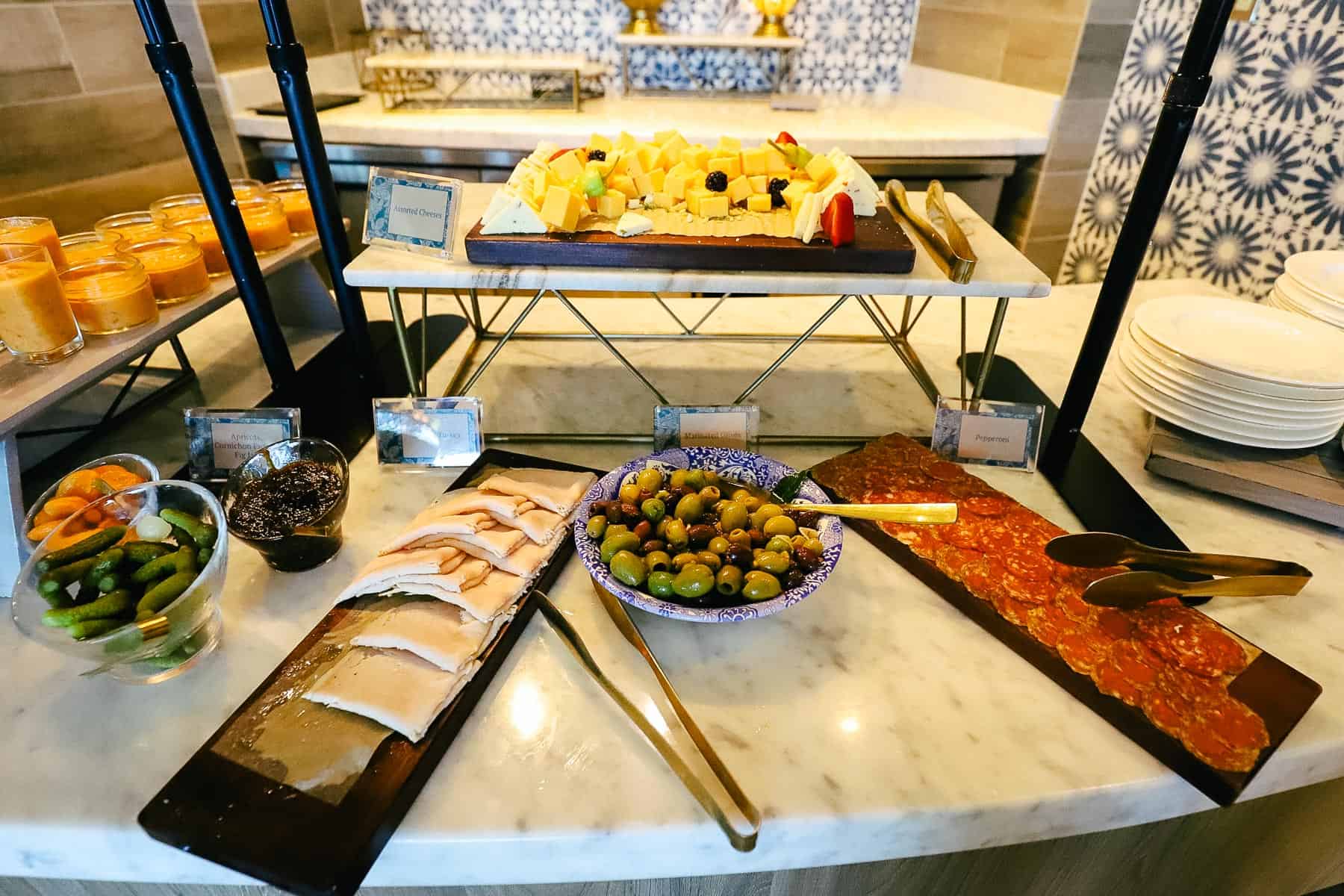 Charcuterie selections included cheese, meats, olives, and other accompaniments.