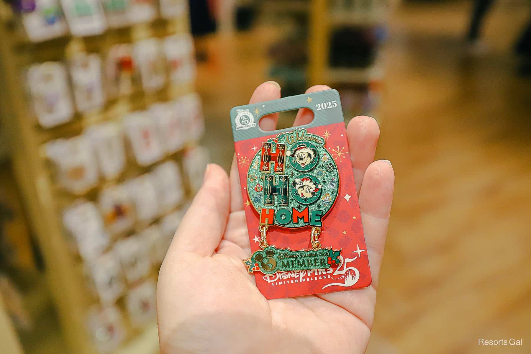 - 2025 Disney Vacation Club Welcome Home Pin: This green pin features Mickey and Minnie with the Welcome Home wording. It has a chain holding a plate that reads “Disney Vacation Club Member.”