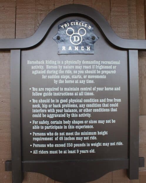 Horseback riding is available at Fort Wilderness. The resort has two stables that make up the Tri-Circle D Ranch. The stable near the Outpost offers trail rides. It sits directly behind the primary bus stop at The Outpost. The trail rides here usually last approximately 45 minutes. They can be booked up to 60 days in advance. You do not have to be a guest of Fort Wilderness to reserve a trail ride.