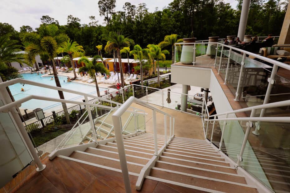 As we make our way to the pool, we’ll continue from the resort’s lobby outside to the raised patio. You can take an elevator or stairs down to the pool from the lobby. This outdoor extension of the lobby provides more seating and lounge chairs.