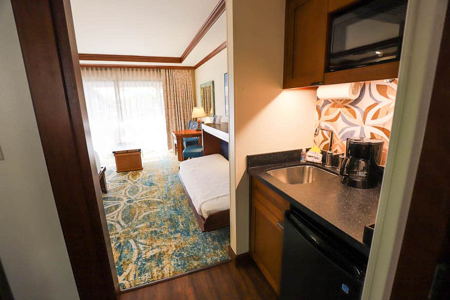 One of the perks of staying in a deluxe studio is that it features a kitchenette. You won’t find this extra amenity in a standard guest room.