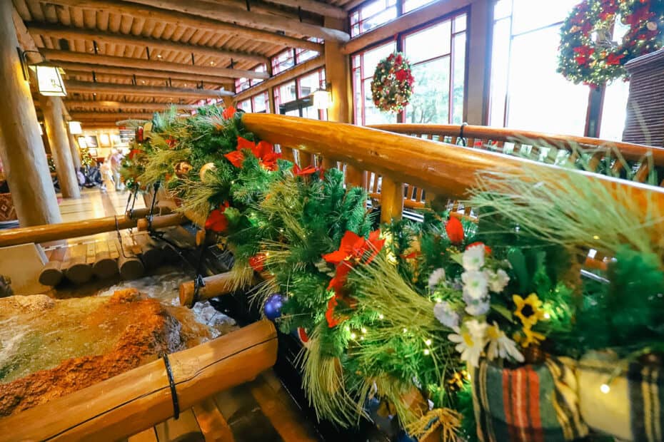 If you arrive at the Wilderness Lodge by boat, you’ll immediately notice the changes in the landscape. Tall trees with Spanish moss line the raised wooden walkways that lead up to the main resort. Those who arrive at the resort’s main entrance will notice wildflowers with touches of holiday decor in the mix. Either way, the Wilderness Lodge is a sight to behold, especially at Christmas.